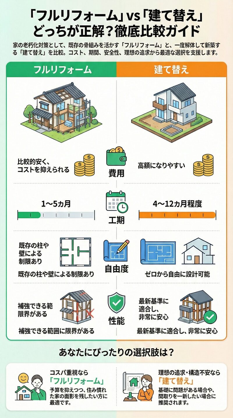 なお、フルリフォームではなく「建て替え」という選択肢もありますが、建て替えの場合は解体費用に加えて新築の住まいを建てるため、トータルコストはより高額になります。ただし、築40年を超える一戸建てでは耐震補強工事や基礎工事などの大規模な改修が必要になることが多く、結果的に建て替えのほうが割安になるケースもあります。