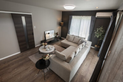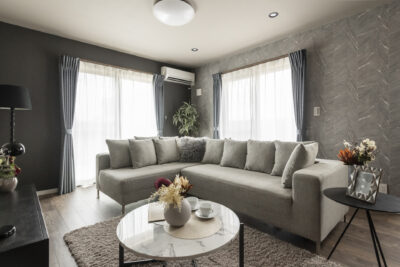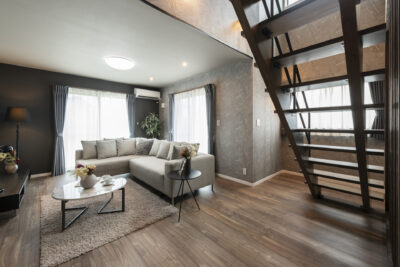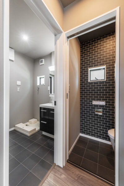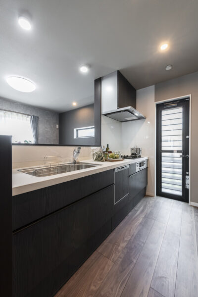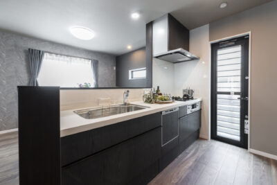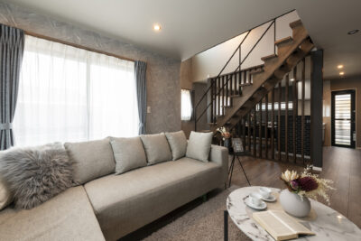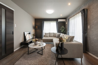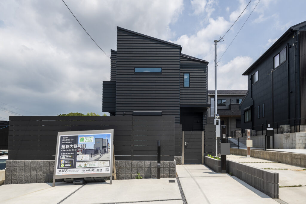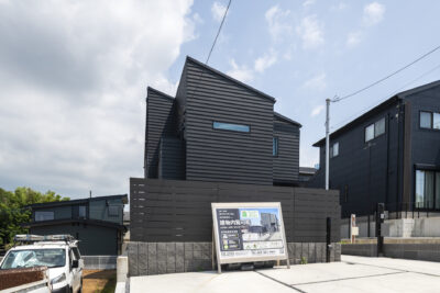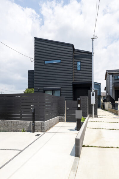 落ち着いたスモーキーブラックの外壁が印象的な外観デザイン。シンプルでモダンな佇まいが街並みに調和します。直線的なラインを基調としたフォルムは、飽きのこない洗練された美しさを持ち、長く愛される住まいの表情を作り出しています。