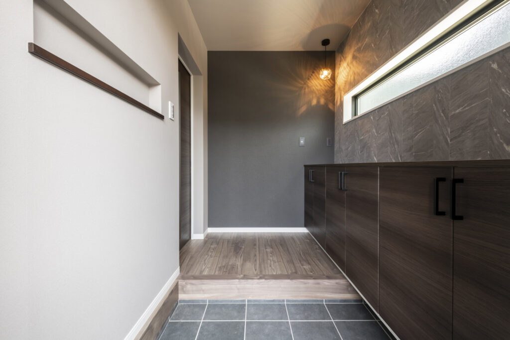 玄関は、天然石調のアクセントウォールとダークブラウンの木目調シューズクローゼットが織りなす、ホテルライクな上質空間です。グレーのタイル床が落ち着いた雰囲気を演出し、帰宅時に心地よい安らぎを与えてくれます。