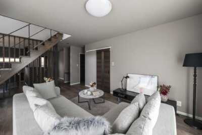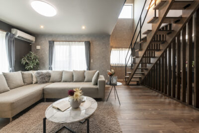 天然石調のアクセントウォールを背景に、階段の直線的なラインが美しく映えます。照明計画も計算されており、階段が立体的に浮かび上がるような陰影が、昼夜を問わずドラマティックな空間を演出します。この階段を中心に、LDK全体がひとつのアート作品のような統一感を持った空間となっています。