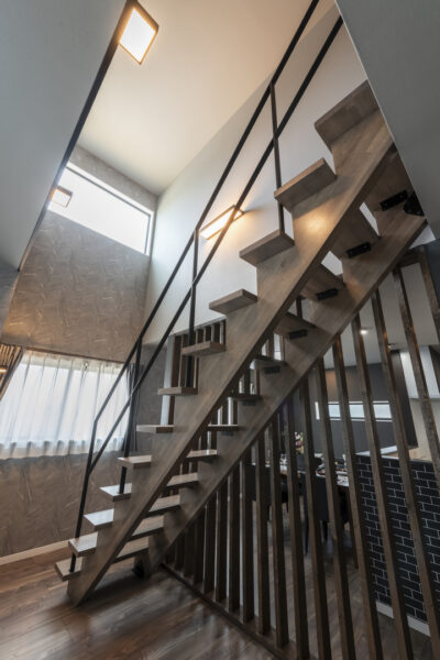 LDK空間のシンボルとなっているのが、スタイリッシュなスケルトン階段です。ブラックのスチールフレームと木製の踏み板を組み合わせた、モダンでありながら温かみを感じるデザイン。階段の蹴込み板をなくしたオープンな構造により、視線が抜けて空間を広く見せる効果があります。縦格子の間仕切りと一体的にデザインされ、リビングとダイニングを緩やかに仕切りながらも、開放感を損なわない絶妙なバランスを保っています。階段を上がる家族の姿が、リビングから自然と目に入り、家族のつながりを感じられる温かな設計です。
