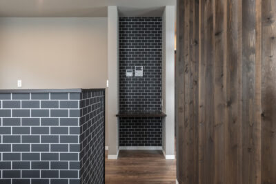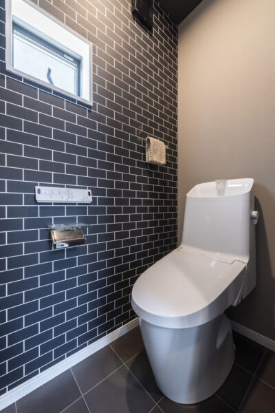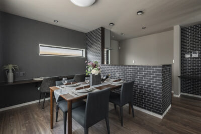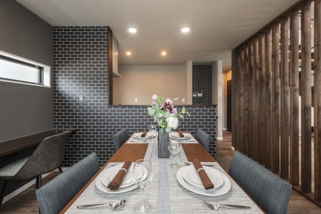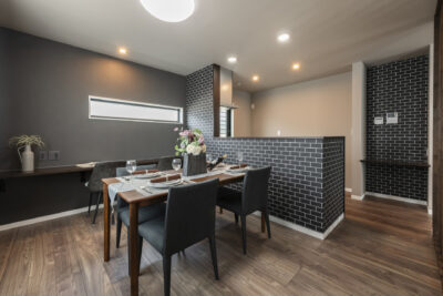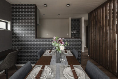 ダイニングエリアには、ブラックのレンガ調タイルをアクセントウォールとして採用。モダンで洗練された雰囲気を演出します。タイルの質感が空間に深みを与え、カフェのような洗練されたインテリアを作り出しています。