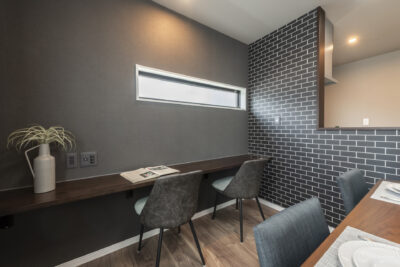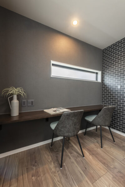 ダイニングスペースの一角には、造作のカウンターデスクを設置。ダークブラウンの木材とグレーの壁紙が、統一感のある上質な空間を作り出しています。横長のスリット窓から自然光が差し込み、明るく快適な作業環境を提供します。