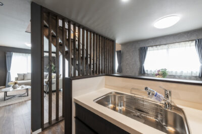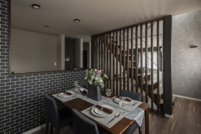 リビングとダイニングの間には、スタイリッシュな格子の間仕切りを設置。空間を緩やかに仕切りながら、開放感は損なわない絶妙なバランスです。視線は通しつつもゾーニングすることで、それぞれの空間に独立性を持たせています。階段との一体感も生み出し、デザイン性の高い空間を実現しました。