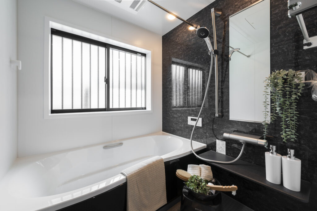 お風呂は、ゆったりとくつろげる1.6坪タイプのシステムバスです。足を伸ばしてゆっくり浸かれる広さで、一日の疲れをしっかりと癒せます。ブラックのアクセントパネルがモダンで高級感のある空間を演出し、毎日のバスタイムを特別なひとときに変えてくれます。