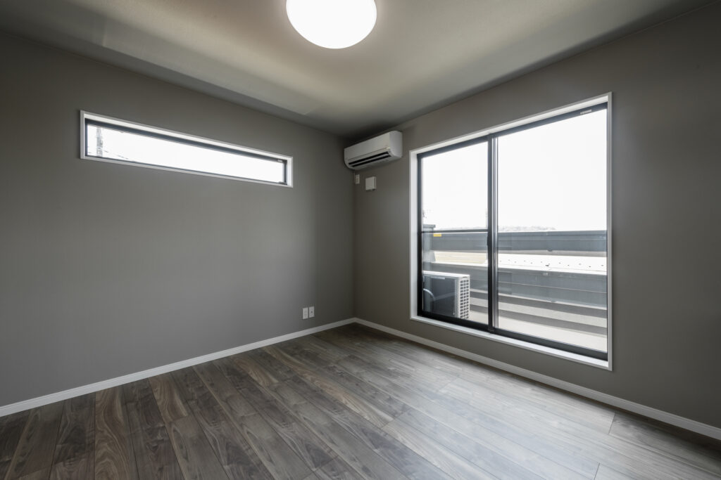 2つの窓から光が差し込む、明るく開放的な主寝室です。朝の目覚めを柔らかな自然光が優しく迎えてくれます。グレーの壁紙が落ち着いた雰囲気を演出し、一日の疲れを癒す質の高い睡眠環境を提供します。
