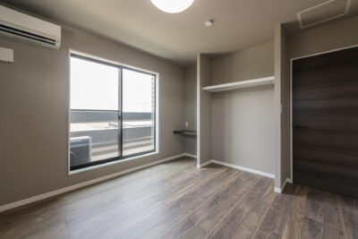 グレーの壁紙とウッド調フローリングが、統一感のある落ち着いた空間を作ります。シンプルなデザインは、家具やインテリアの配置を選ばず、自由にコーディネートできます。バルコニーへ直接アクセスできる掃き出し窓は、洗濯物を干す際の動線も抜群です。大きな窓から自然光がたっぷり入り、明るく開放的な室内を実現しています。風通しも良好で、快適性を保ちます。
