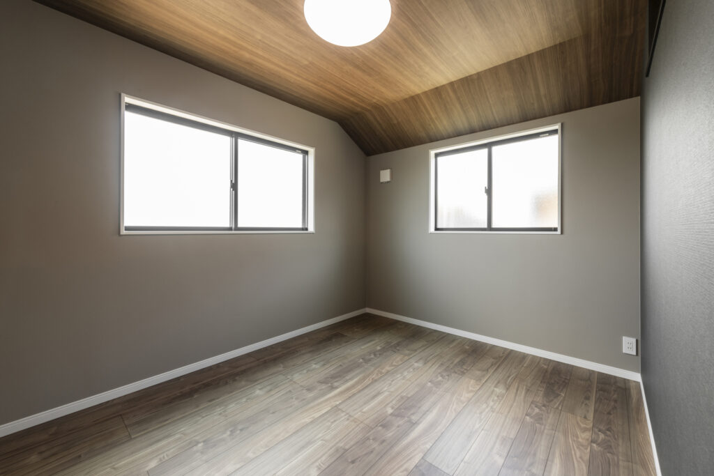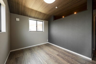 グレーの壁紙とウッド調フローリングで統一された室内は、シンプルで飽きのこないデザイン。お子様の成長に合わせて、自由にコーディネートできます。学習机やベッドを置いても窮屈さを感じない適度な広さで、勉強にも休息にも適した環境です。