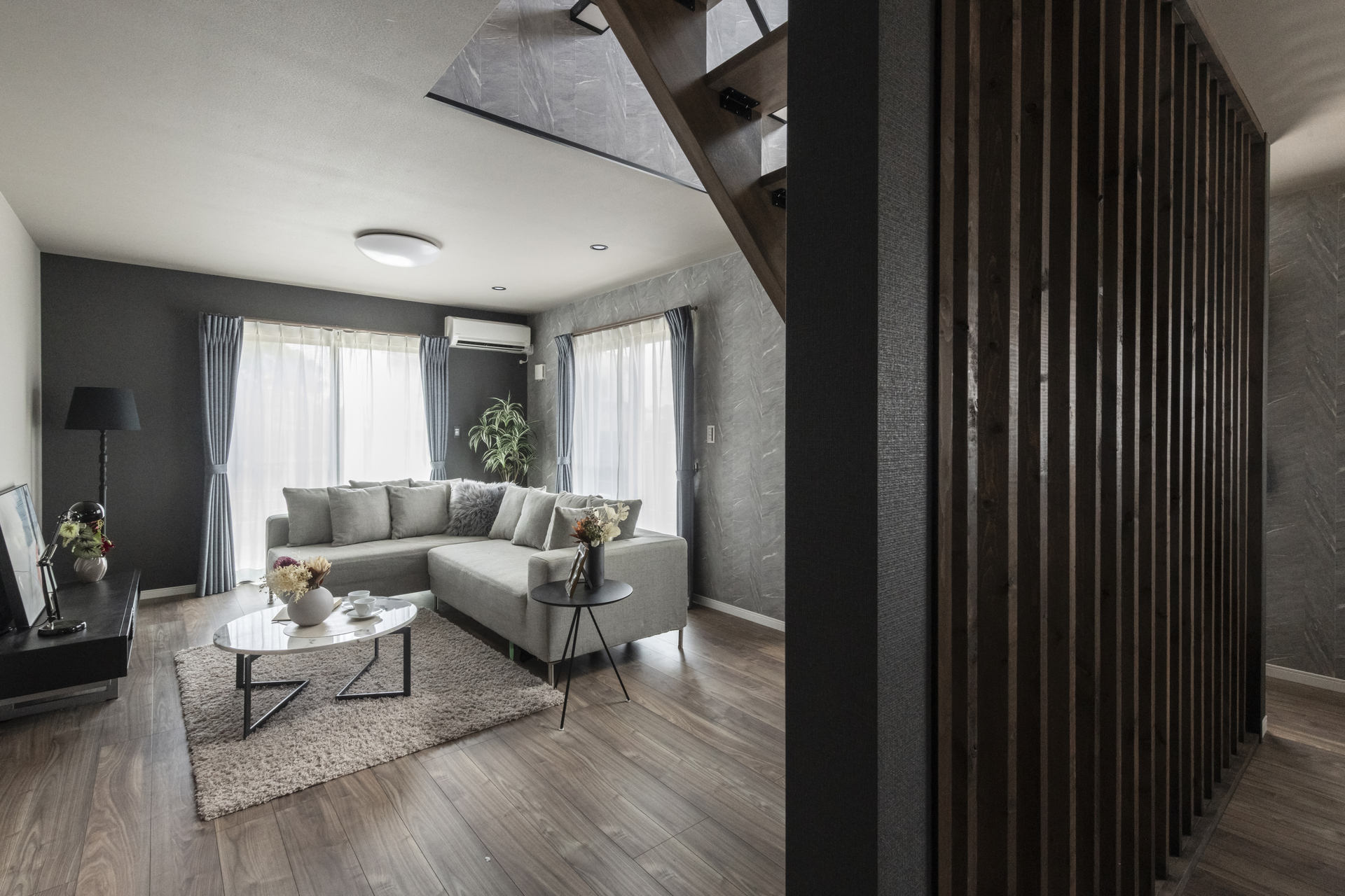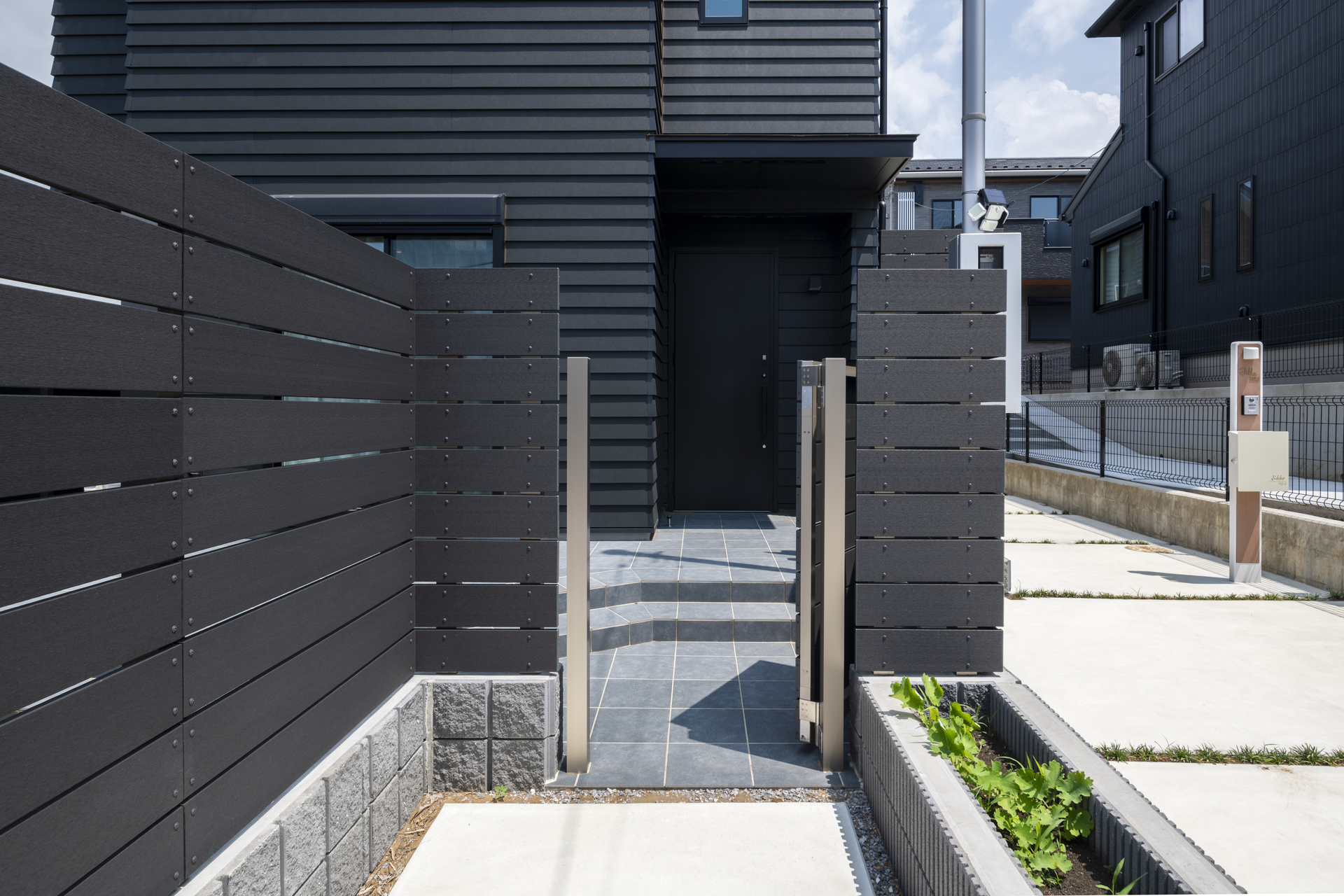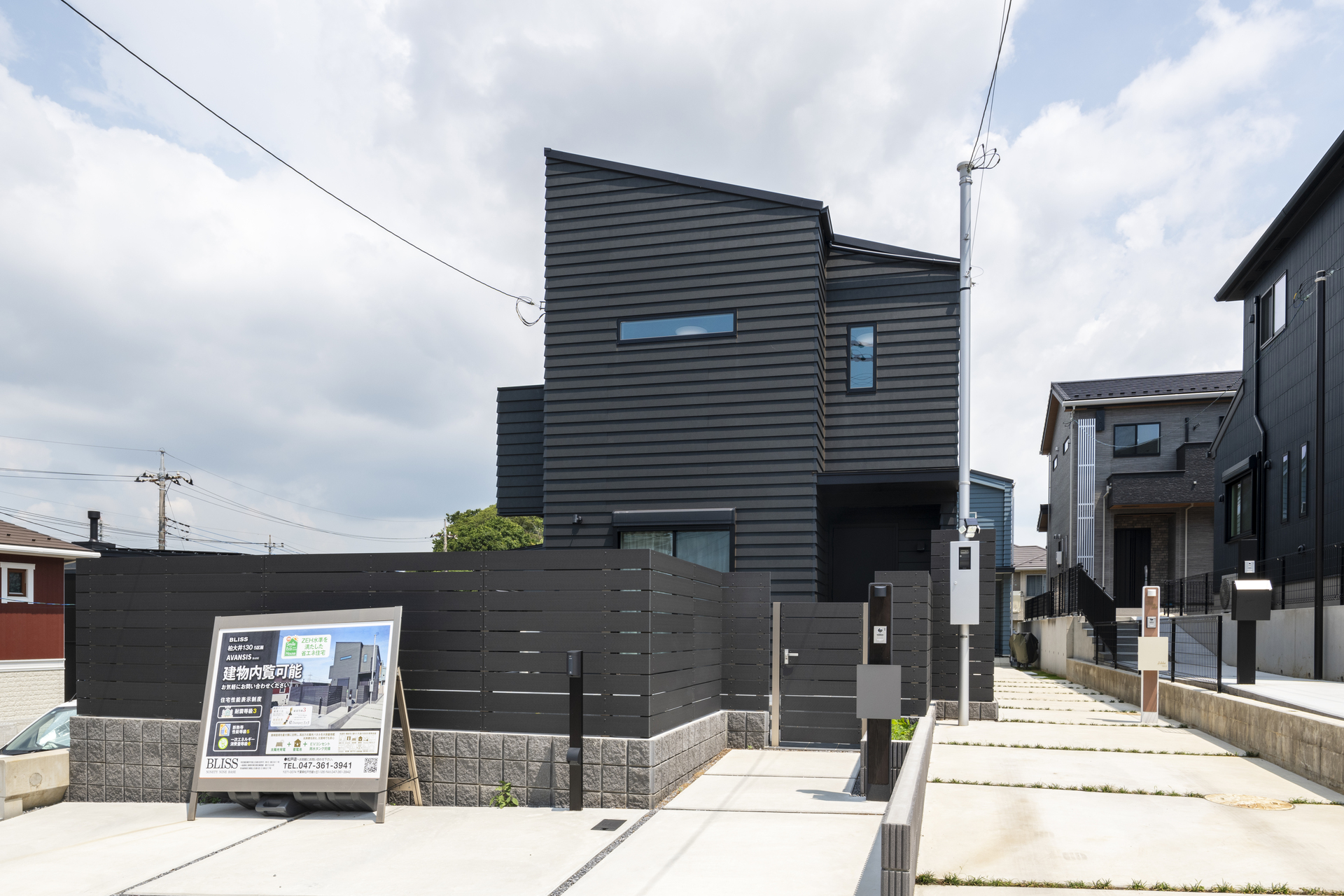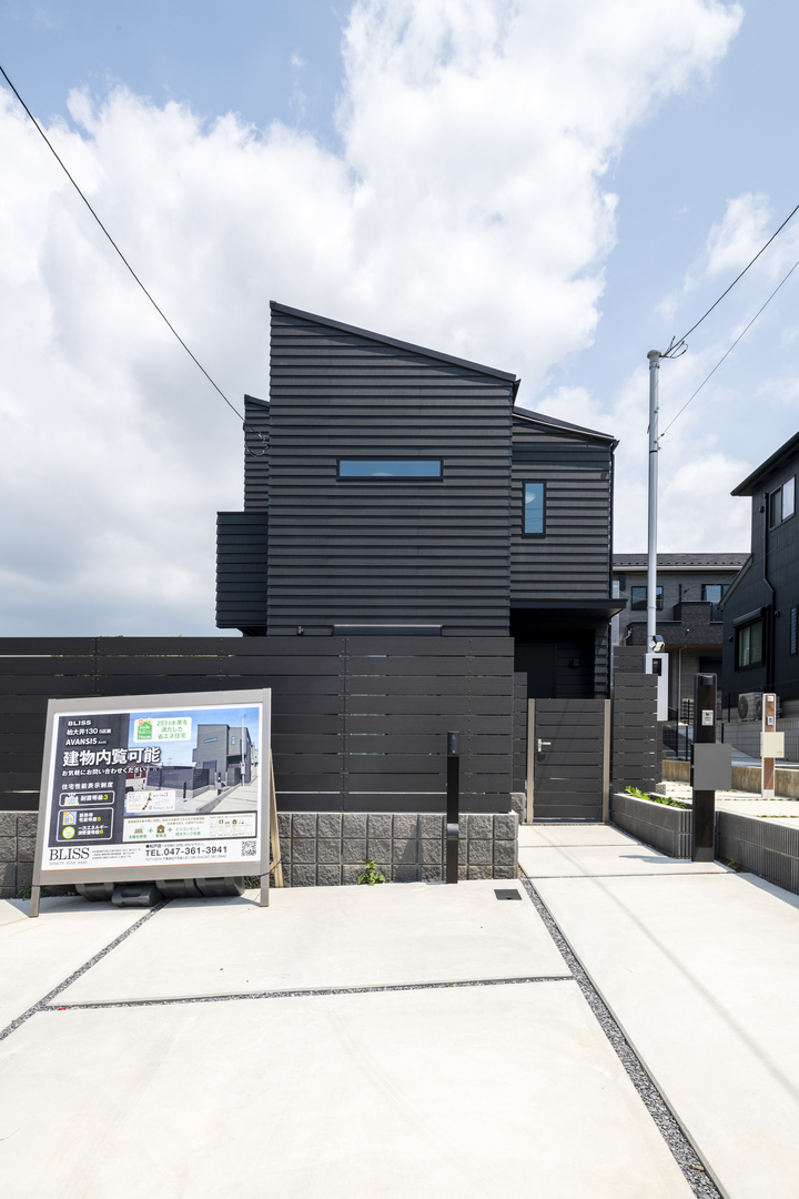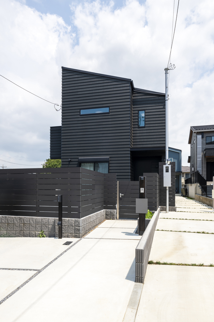 落ち着いたスモーキーブラックの外壁が印象的な外観デザイン。シンプルでモダンな佇まいが街並みに調和します。直線的なラインを基調としたフォルムは、飽きのこない洗練された美しさを持ち、長く愛される住まいの表情を作り出しています。