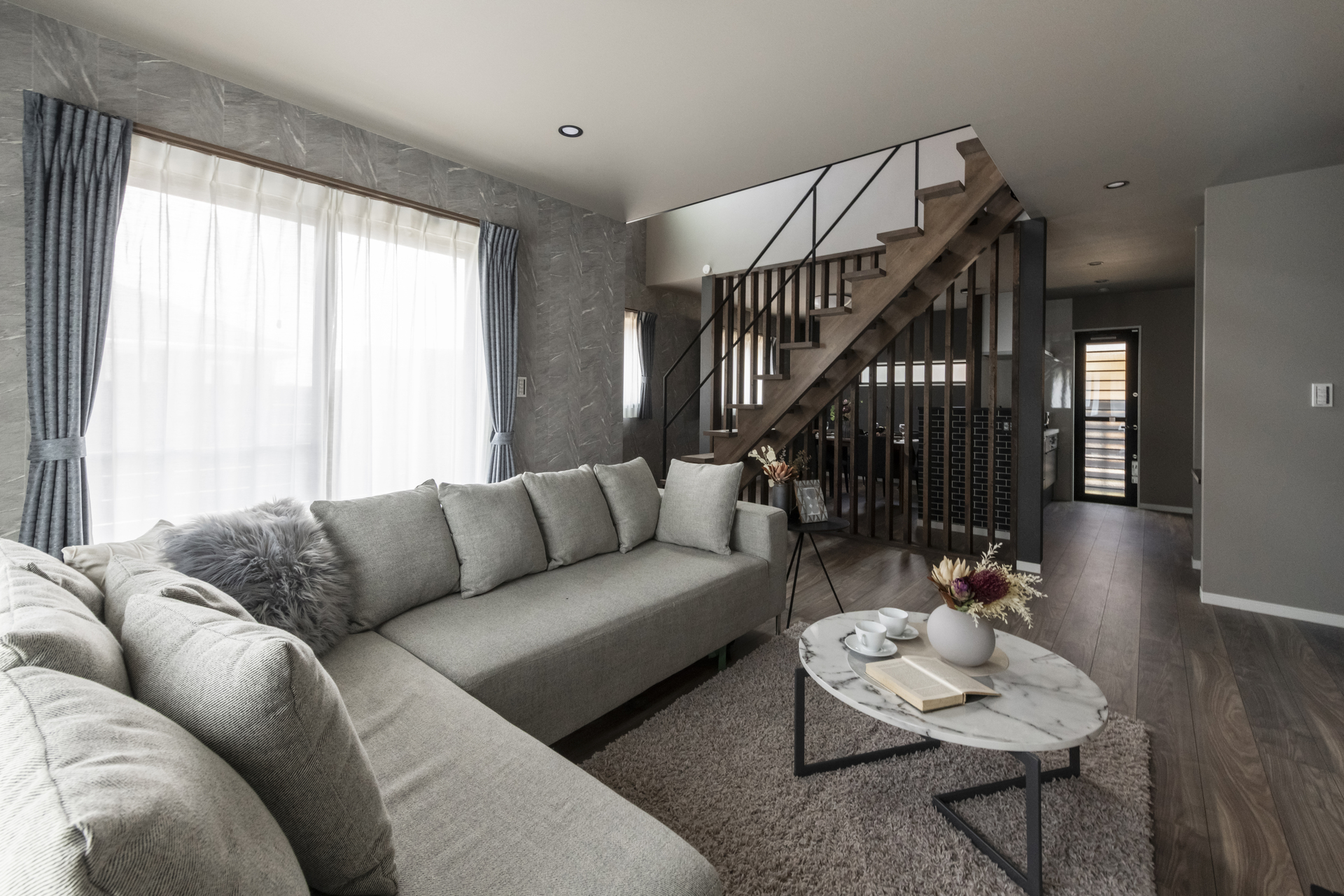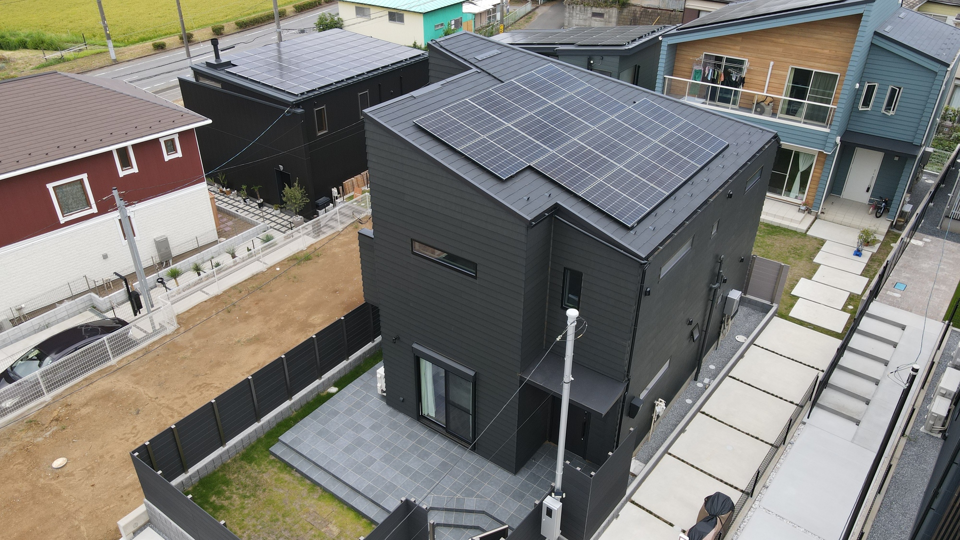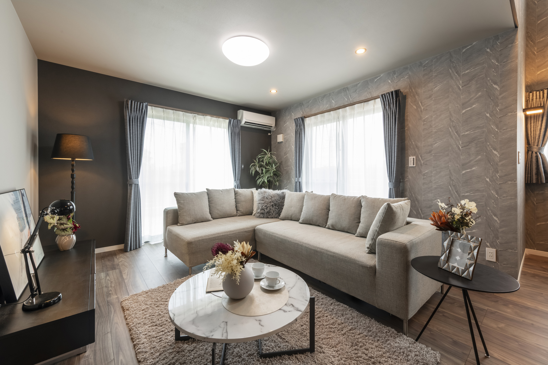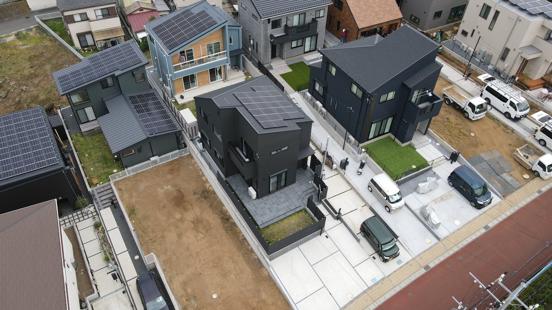 落ち着いたスモーキーブラックの外壁が印象的な外観デザイン。シンプルでモダンな佇まいが街並みに調和します。直線的なラインを基調としたフォルムは、飽きのこない洗練された美しさを持ち、長く愛される住まいの表情を作り出しています。