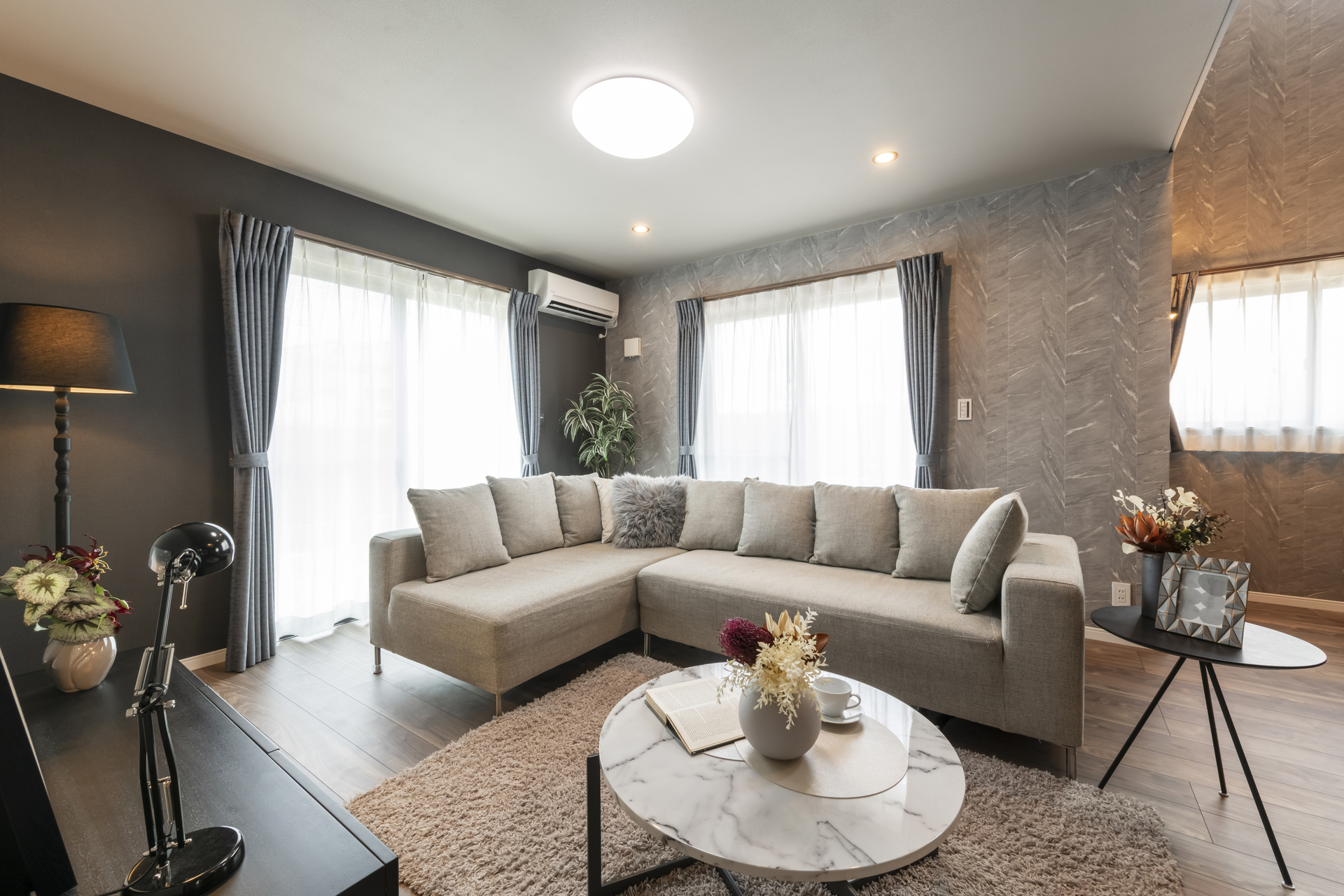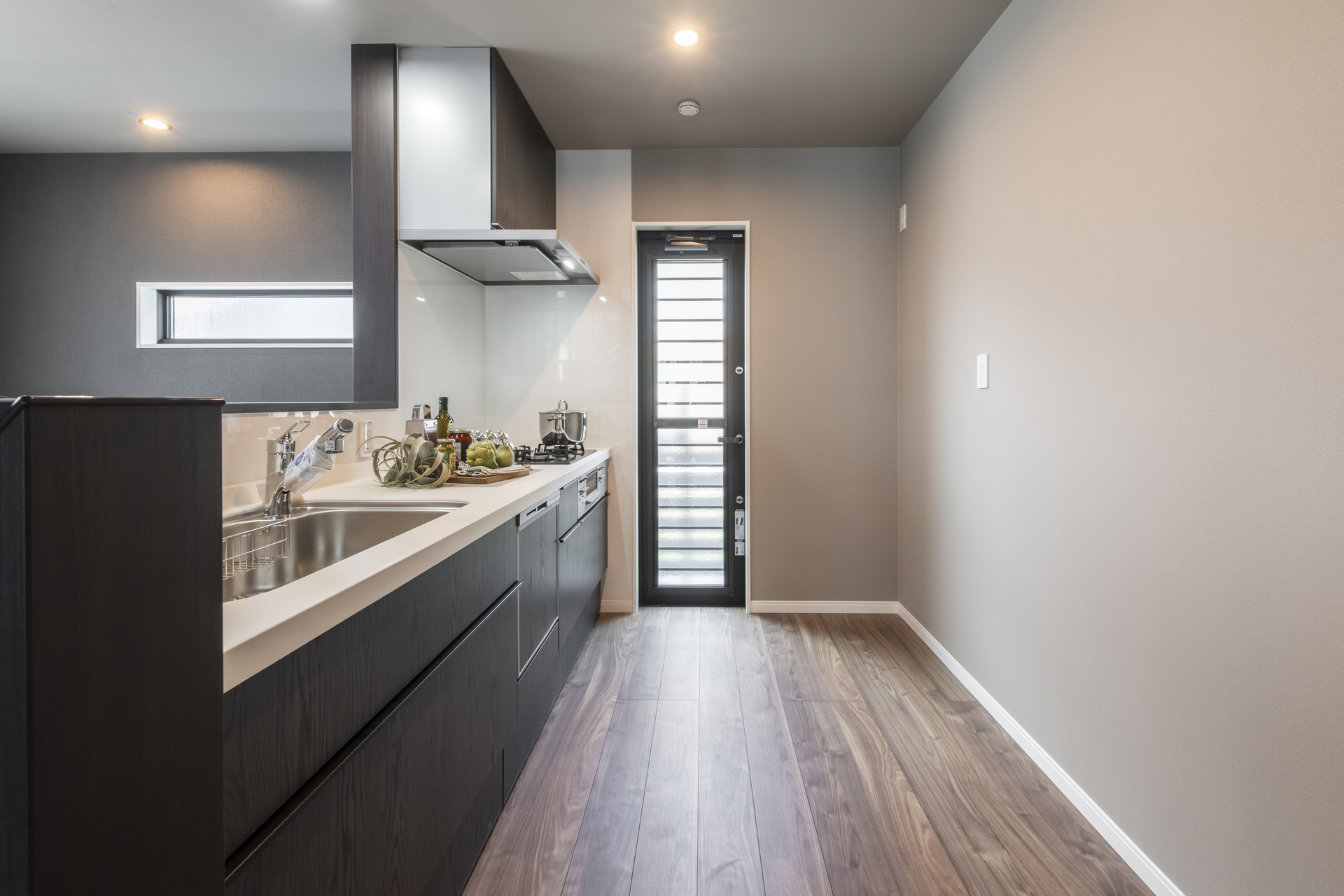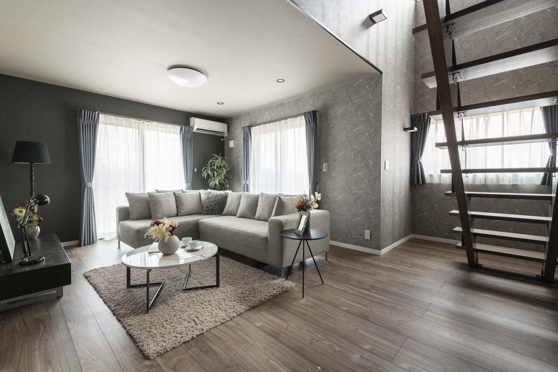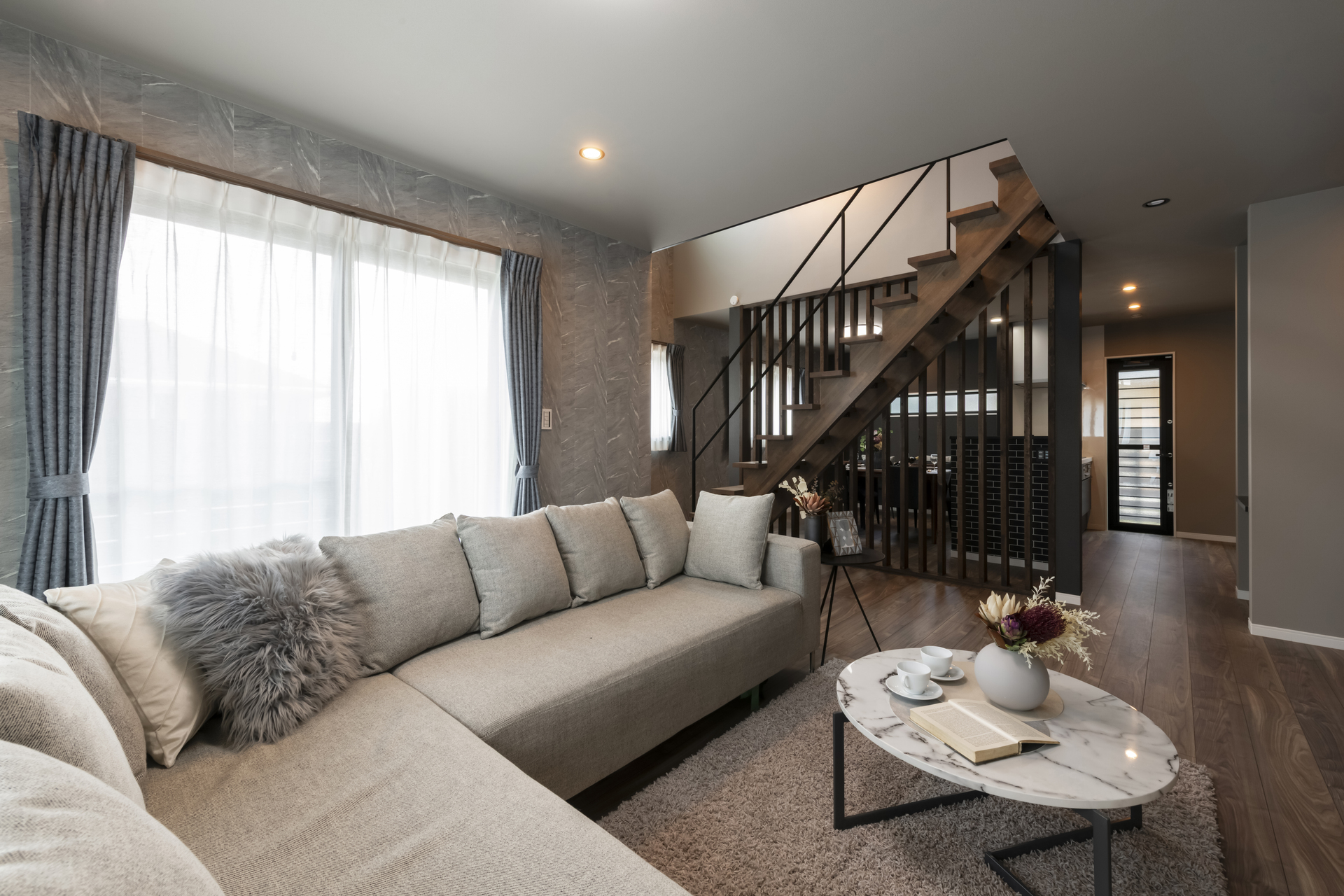 落ち着いたスモーキーブラックの外壁が印象的な外観デザイン。シンプルでモダンな佇まいが街並みに調和します。直線的なラインを基調としたフォルムは、飽きのこない洗練された美しさを持ち、長く愛される住まいの表情を作り出しています。