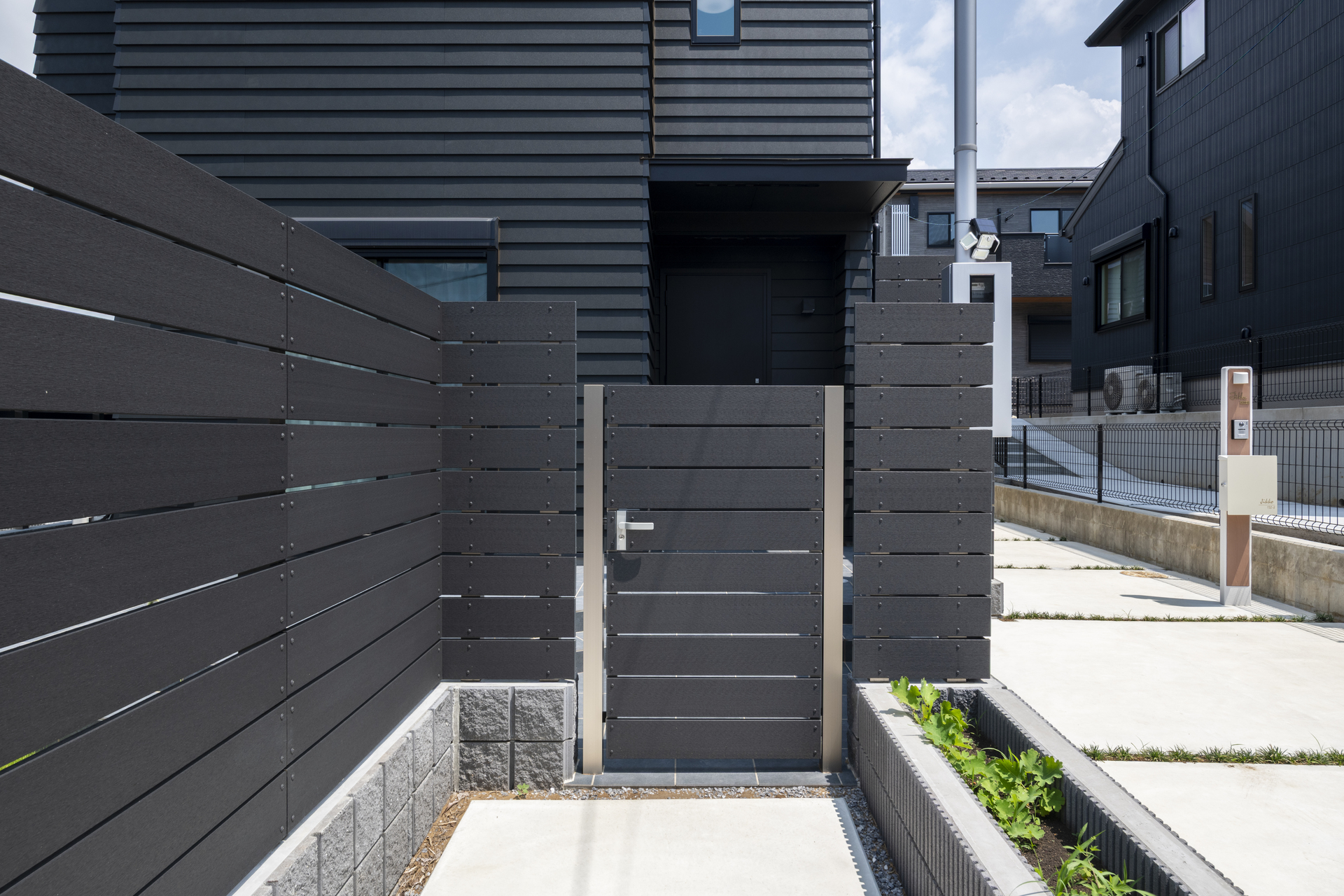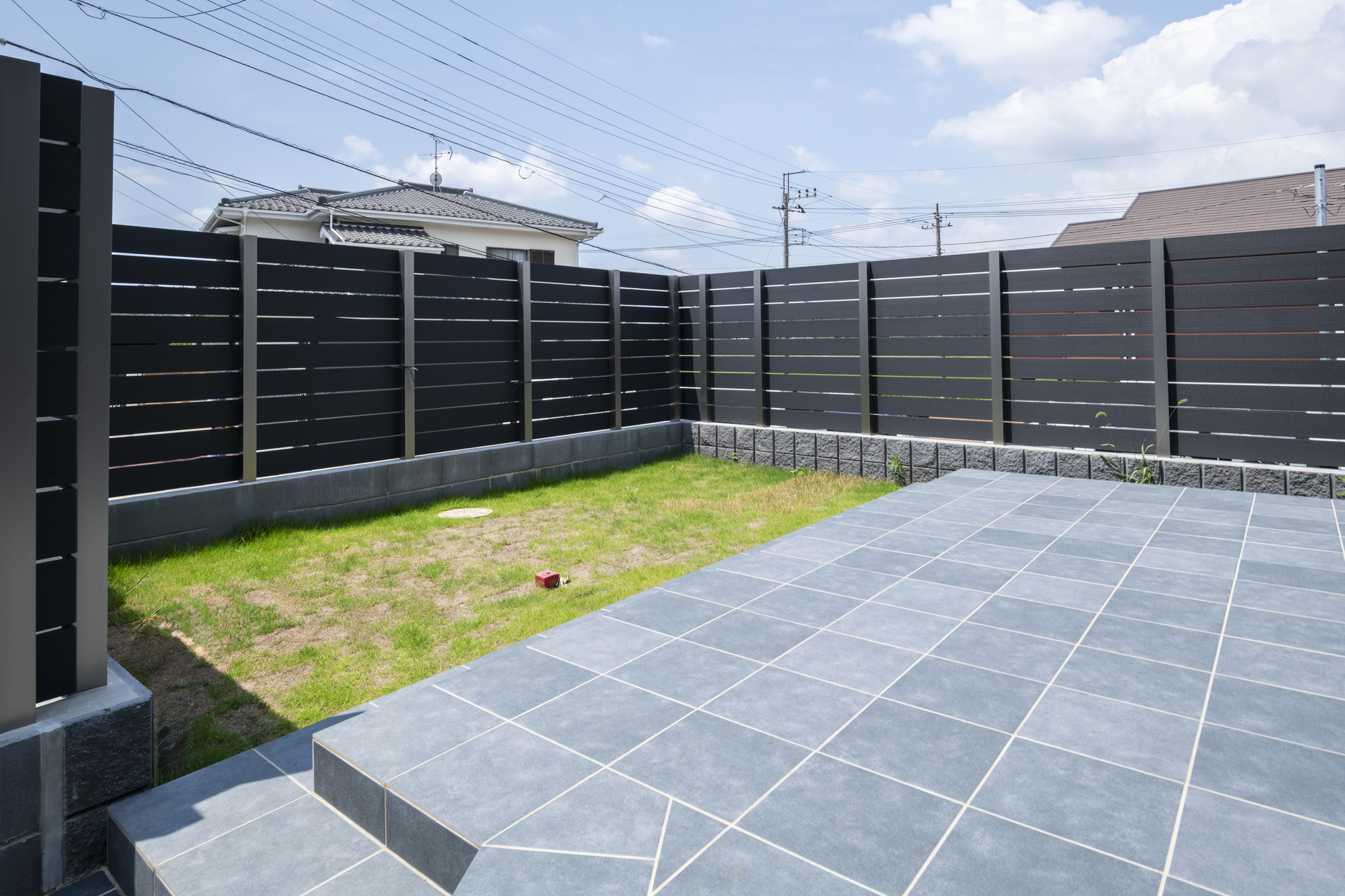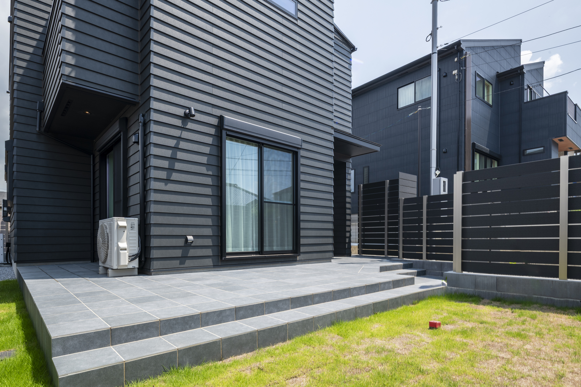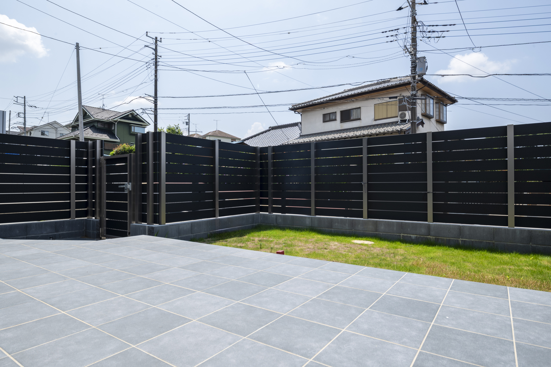 十分な広さがあるテラスでは、ガーデンファニチャーを配置してアウトドアリビングなども楽しむことができます。ブラックの横板フェンスで周囲をしっかりと囲んでおり、プライバシーを確保しながら開放的な空間を楽しめます。