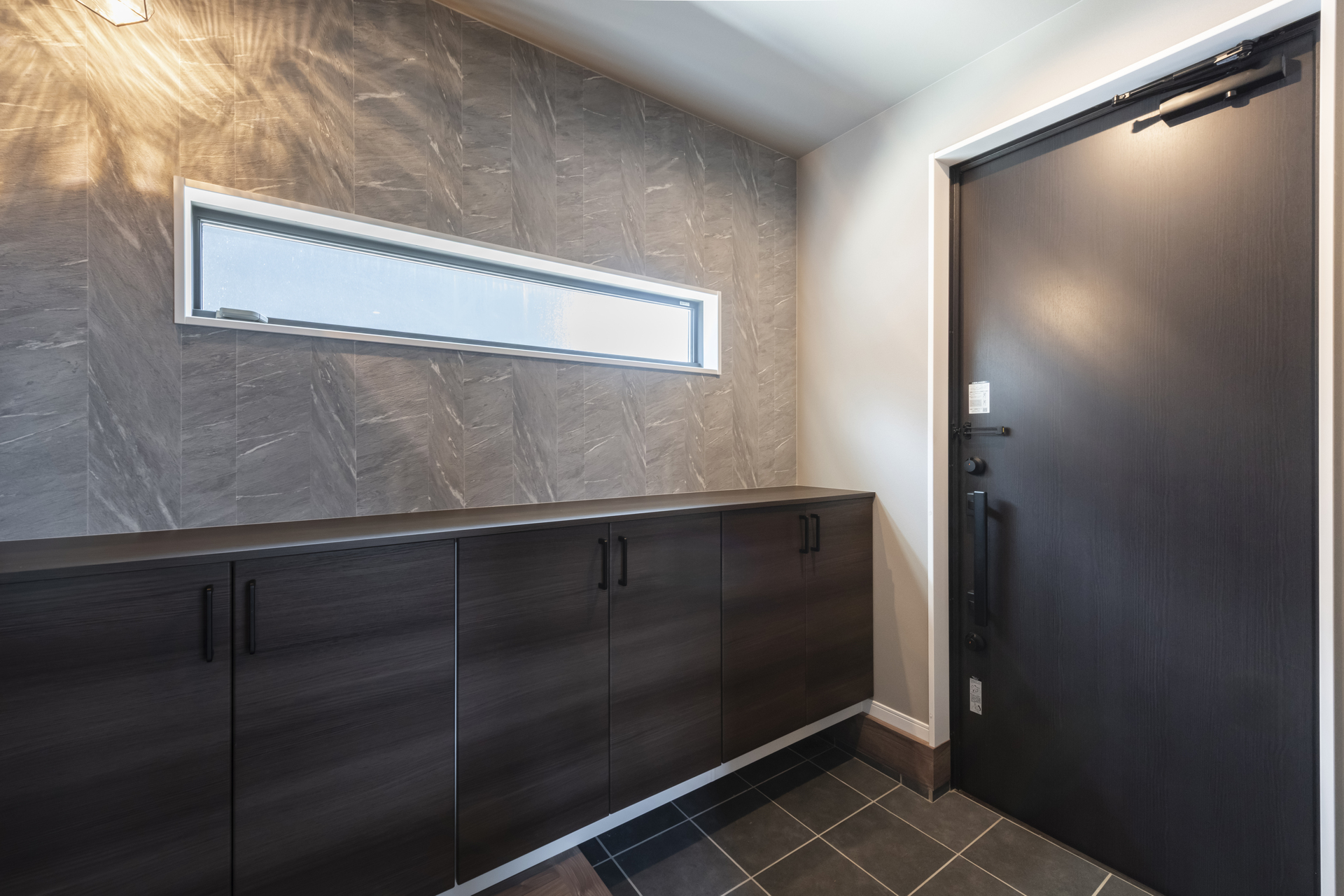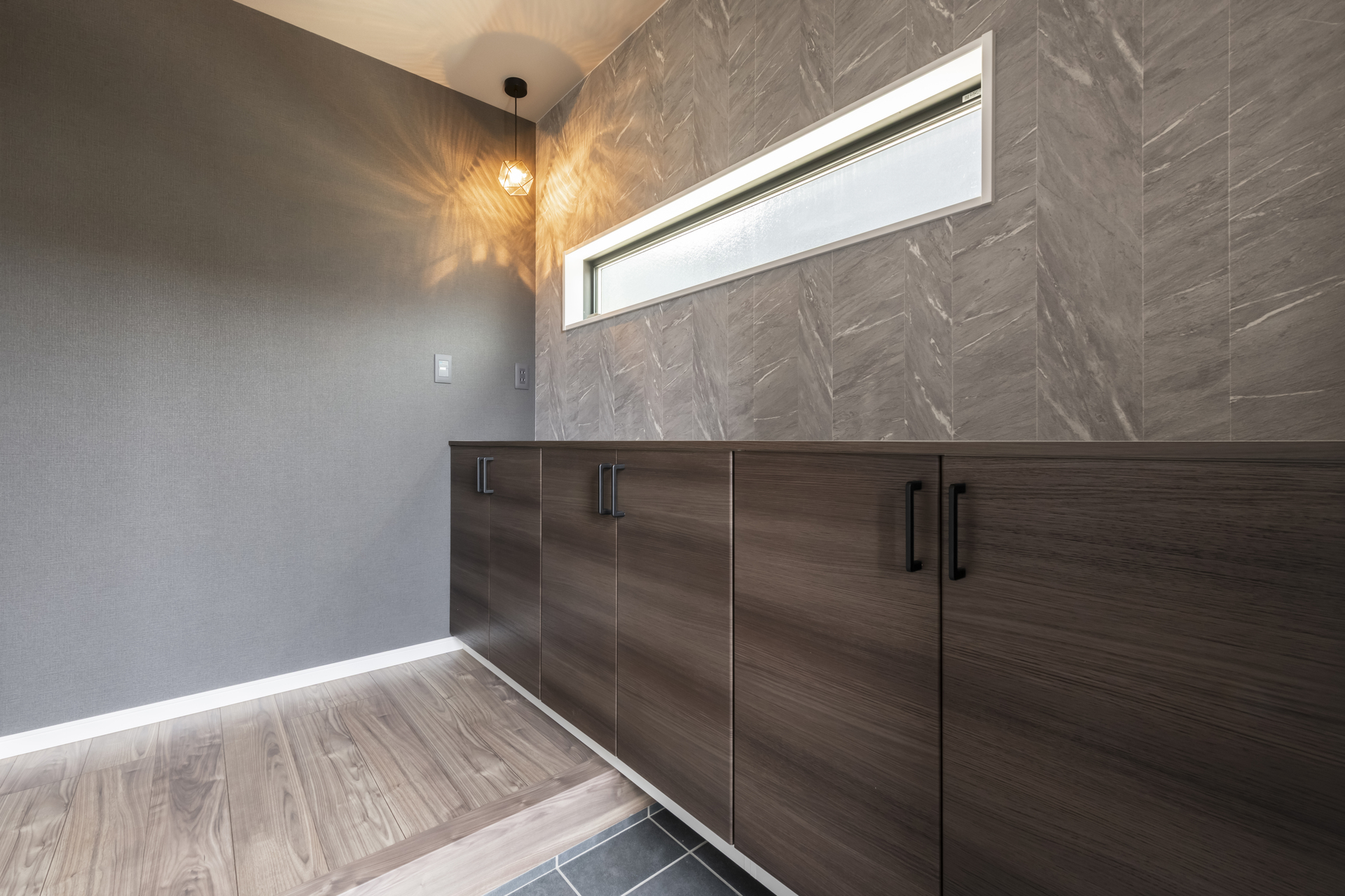 デザイン性の高いペンダントライトが、空間に温かな光と陰影を生み出します。横長のスリット窓から差し込む自然光が、玄関を明るく開放的に見せます。大容量のシューズクローゼットは、ご家族の靴をたっぷり収納できる実用性の高さが魅力。扉付きで中を隠せるため、いつもすっきりとした玄関を保てます。