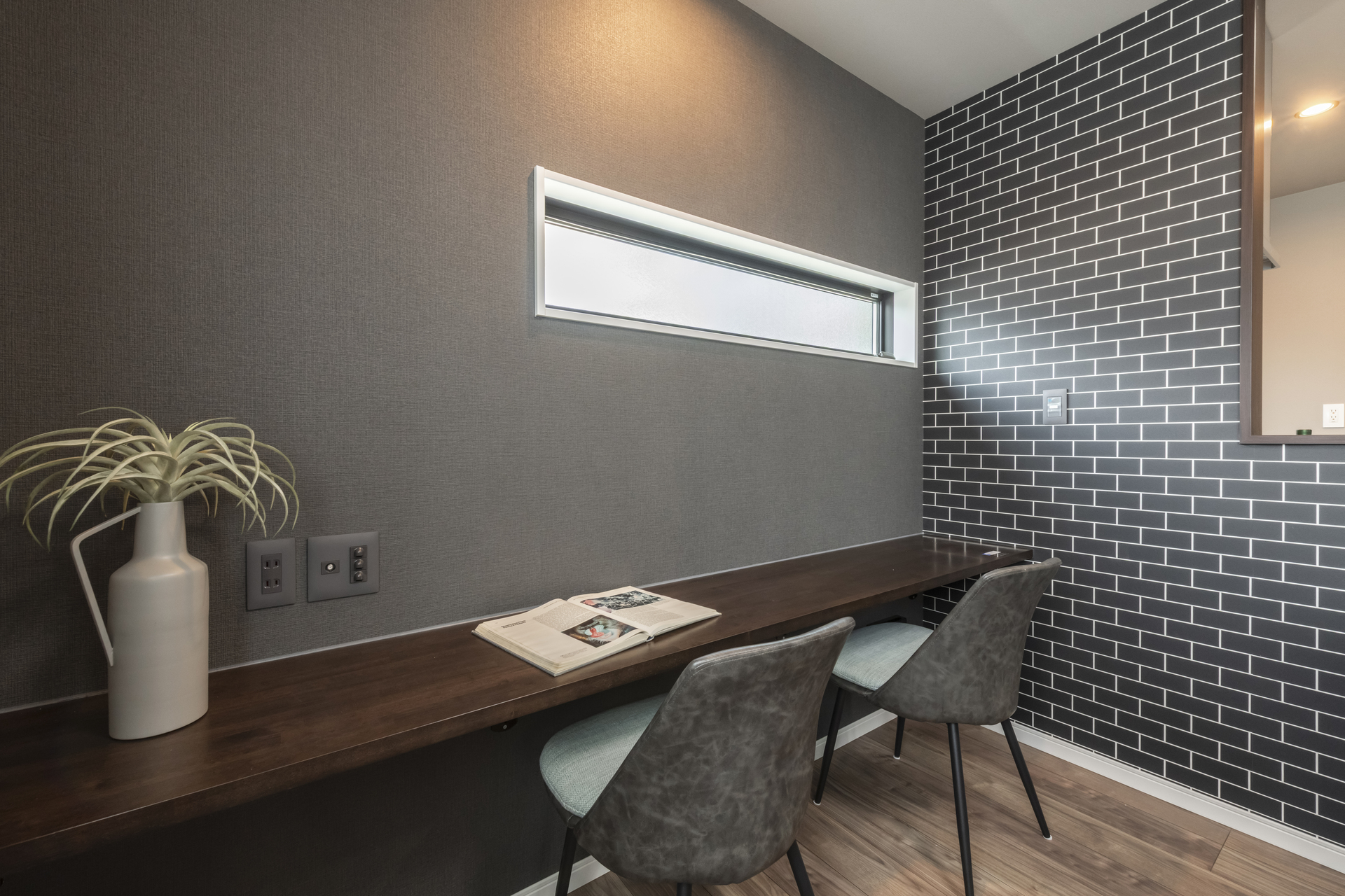 ダイニングスペースの一角には、造作のカウンターデスクを設置。ダークブラウンの木材とグレーの壁紙が、統一感のある上質な空間を作り出しています。横長のスリット窓から自然光が差し込み、明るく快適な作業環境を提供します。