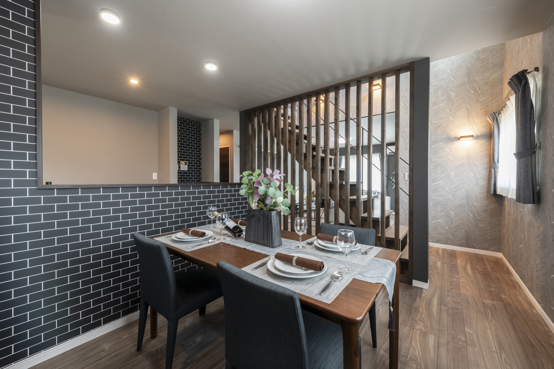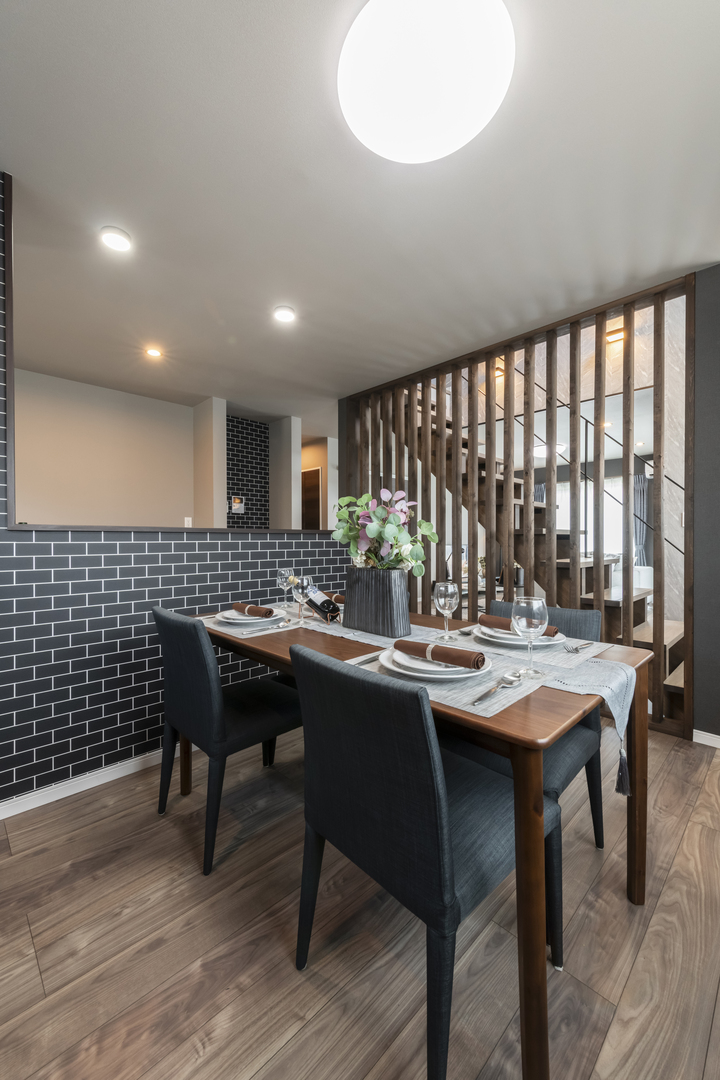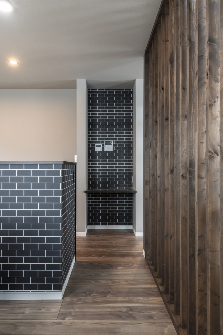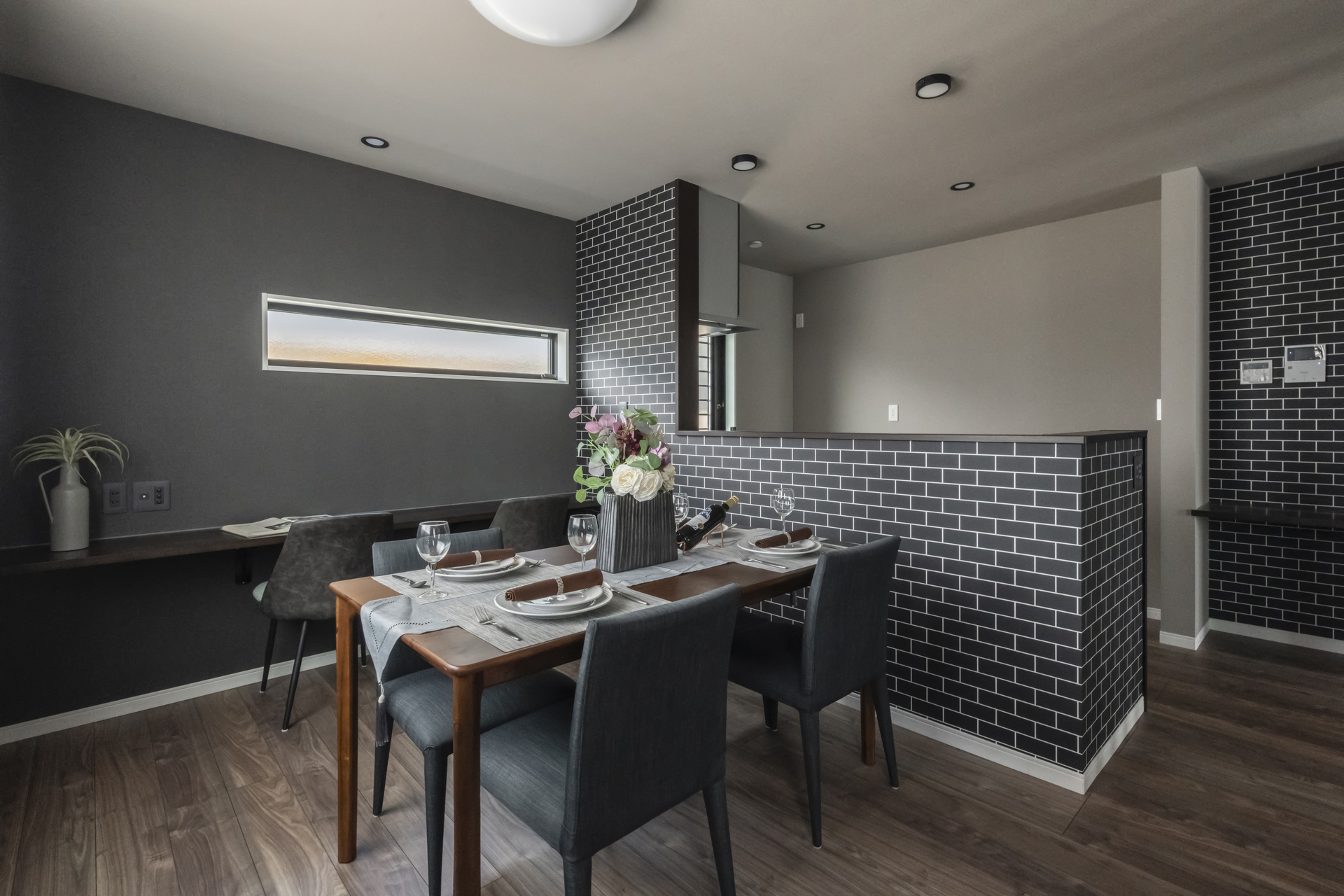 ダイニングエリアには、ブラックのレンガ調タイルをアクセントウォールとして採用。モダンで洗練された雰囲気を演出します。タイルの質感が空間に深みを与え、カフェのような洗練されたインテリアを作り出しています。
