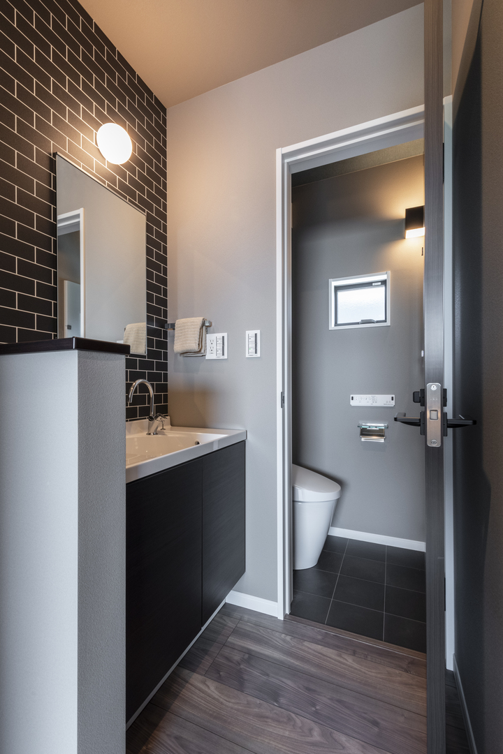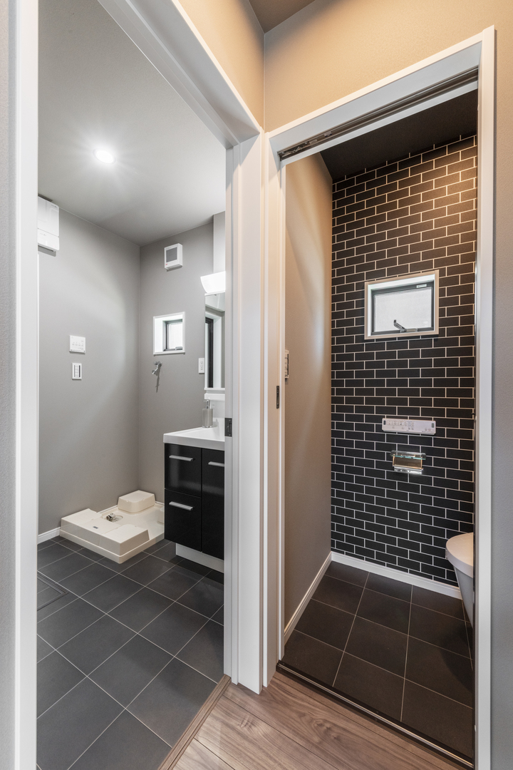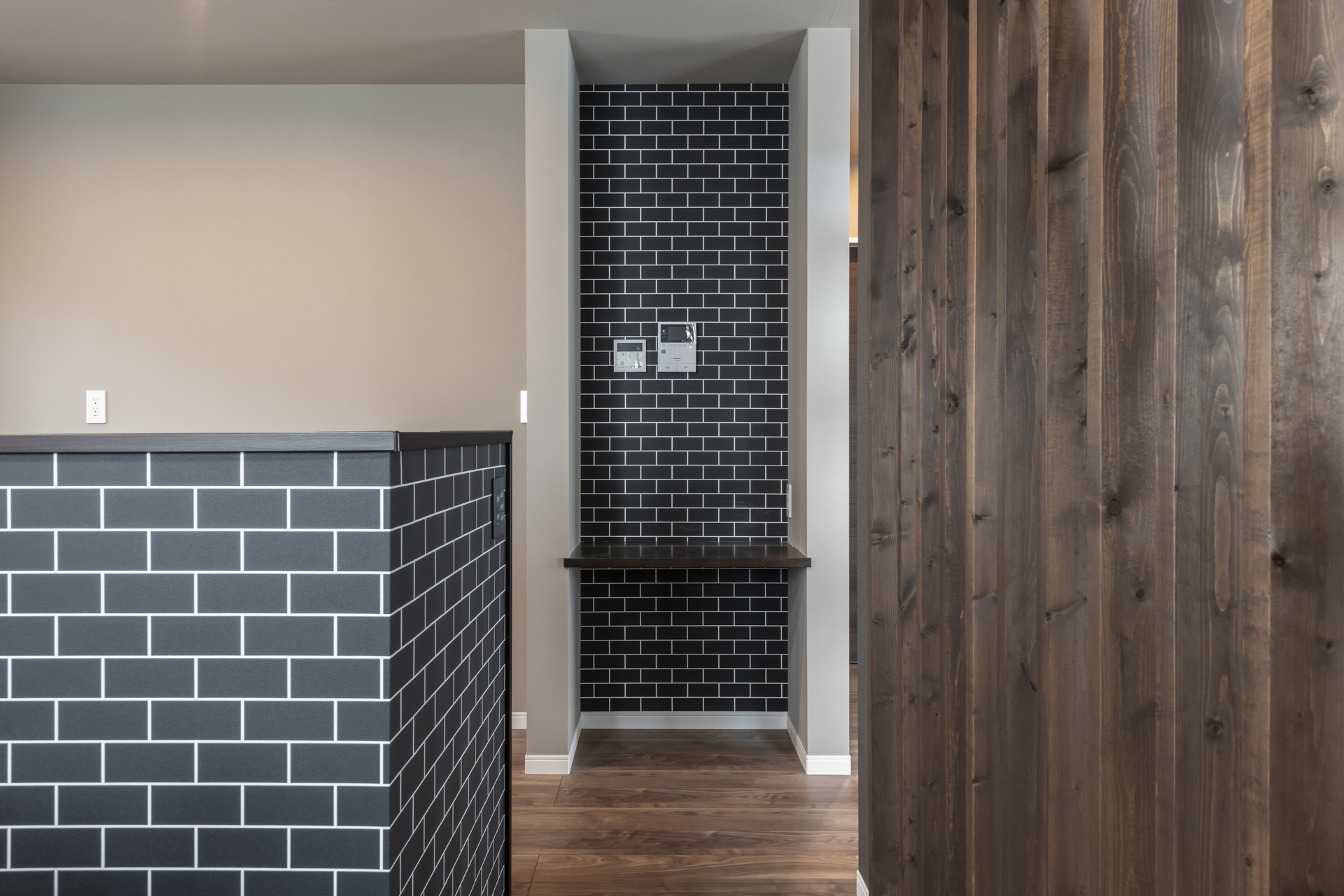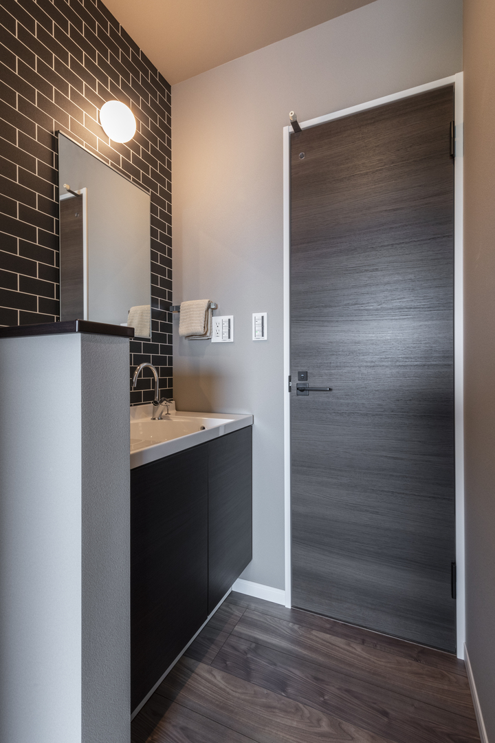 ダイニングエリアには、ブラックのレンガ調タイルをアクセントウォールとして採用。モダンで洗練された雰囲気を演出します。タイルの質感が空間に深みを与え、カフェのような洗練されたインテリアを作り出しています。