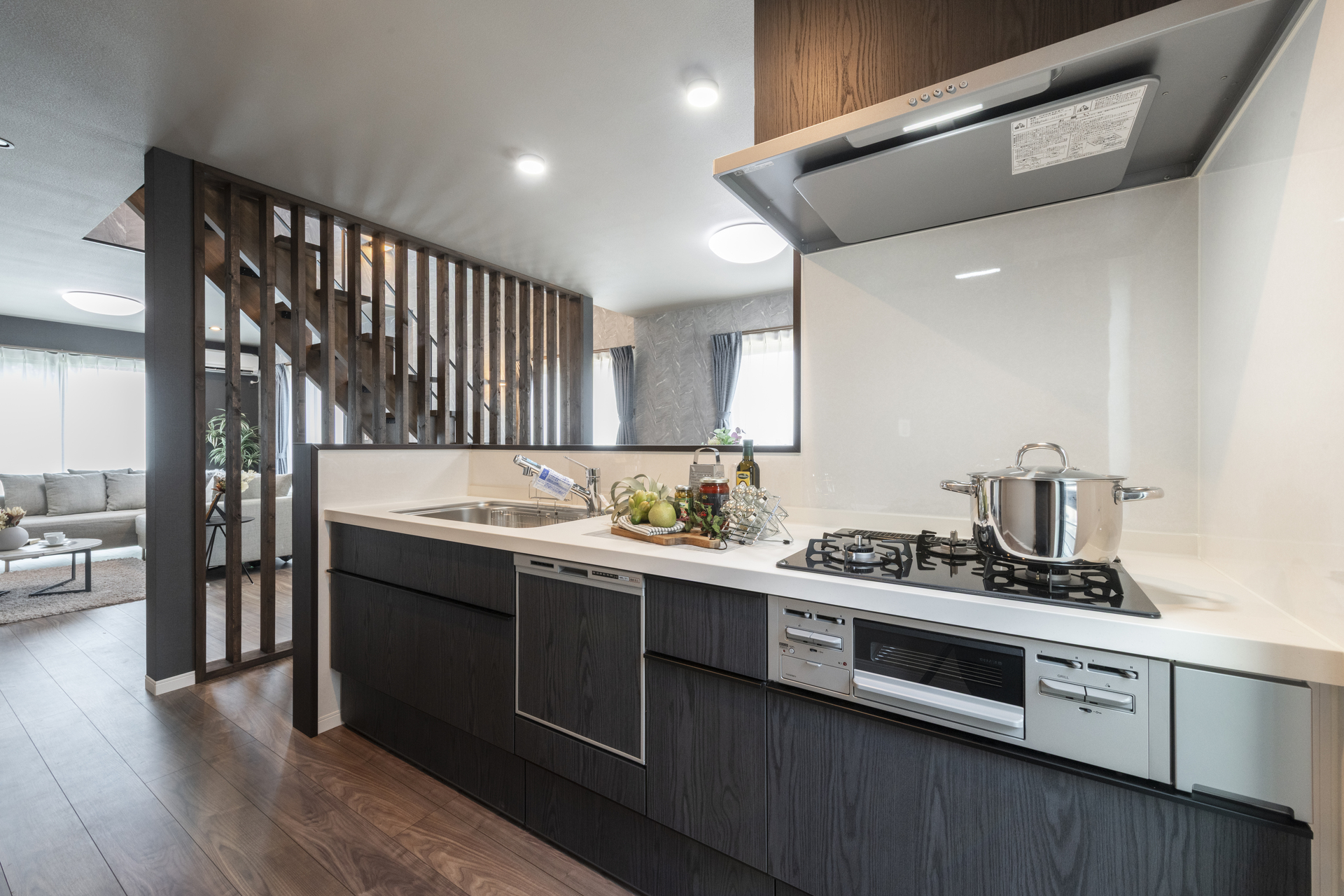 食器洗い乾燥機を標準装備しているため、食後の片付けが驚くほど楽になります。水道代の節約にもつながり、家事の時短と経済性を両立。キャビネットはダークな木目調で、落ち着いた高級感を演出しています。