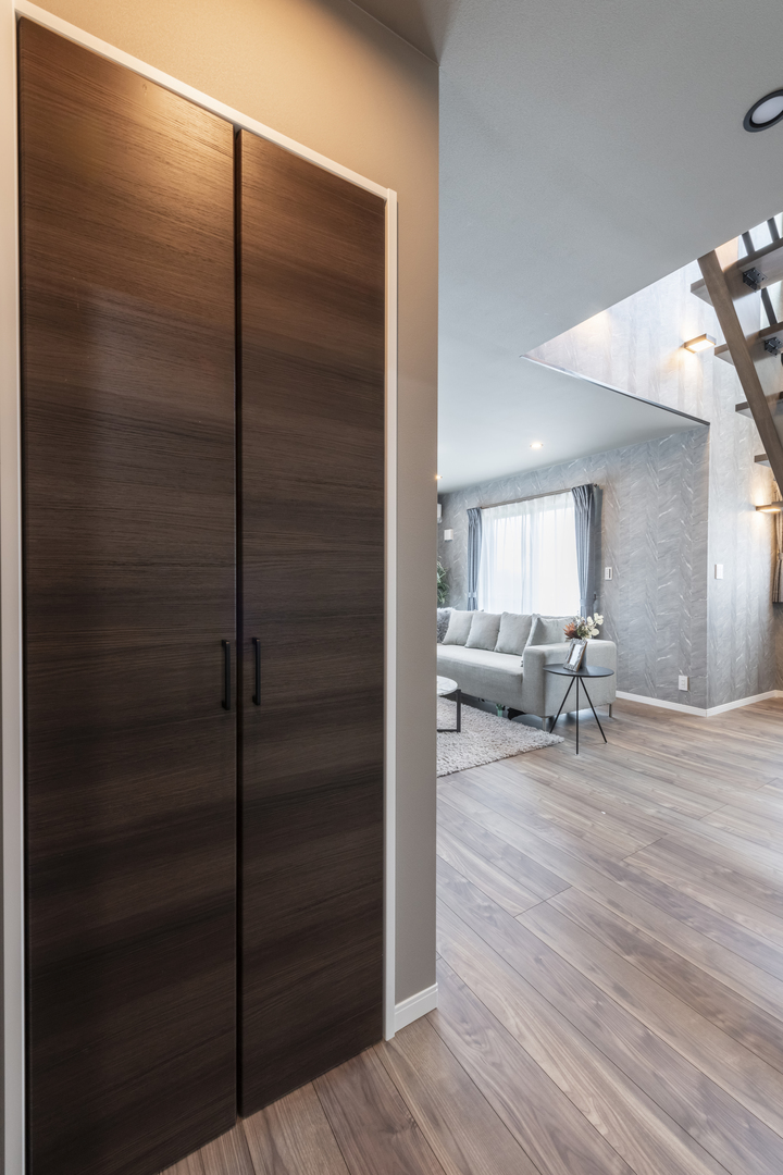 玄関は、天然石調のアクセントウォールとダークブラウンの木目調シューズクローゼットが織りなす、ホテルライクな上質空間です。グレーのタイル床が落ち着いた雰囲気を演出し、帰宅時に心地よい安らぎを与えてくれます。