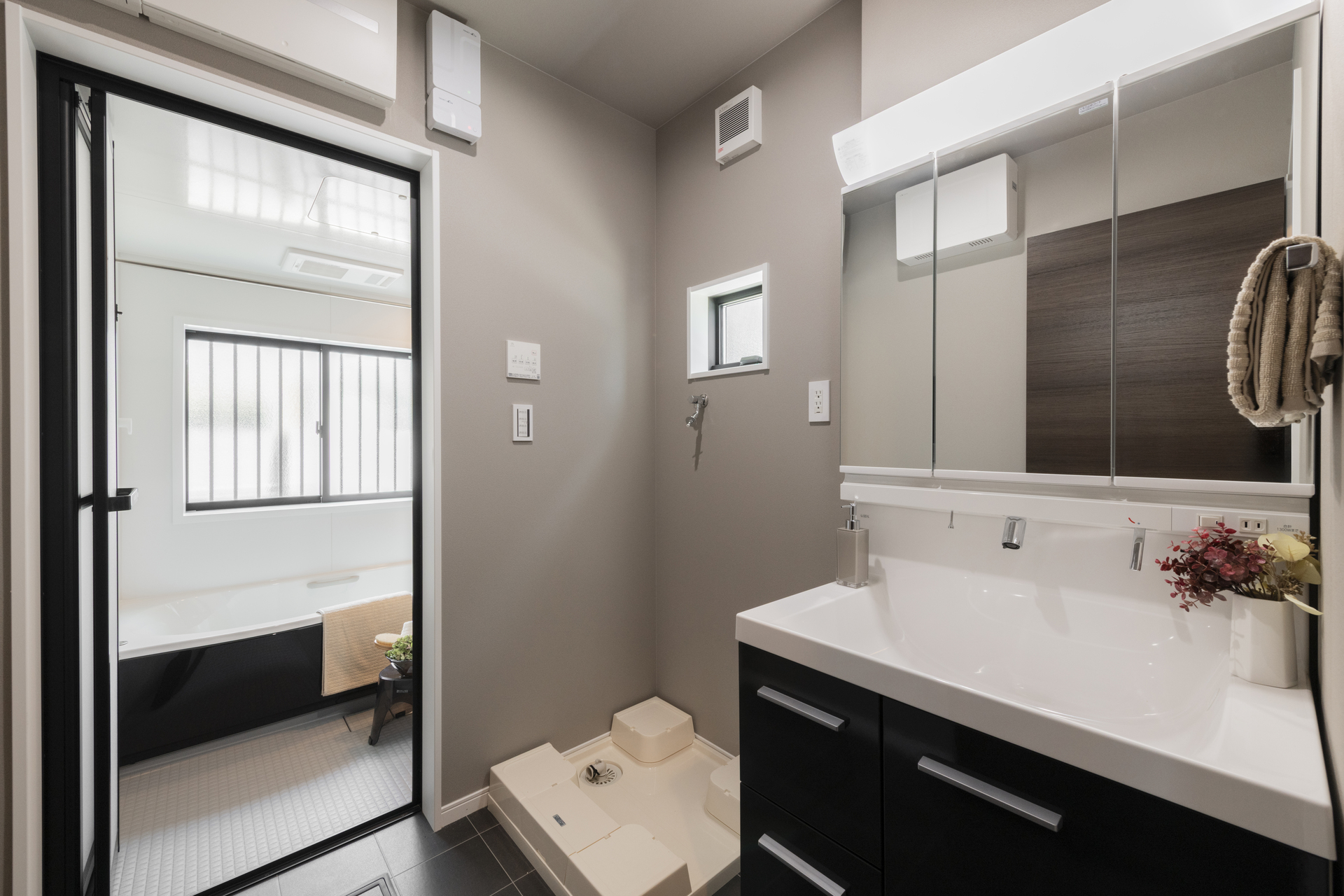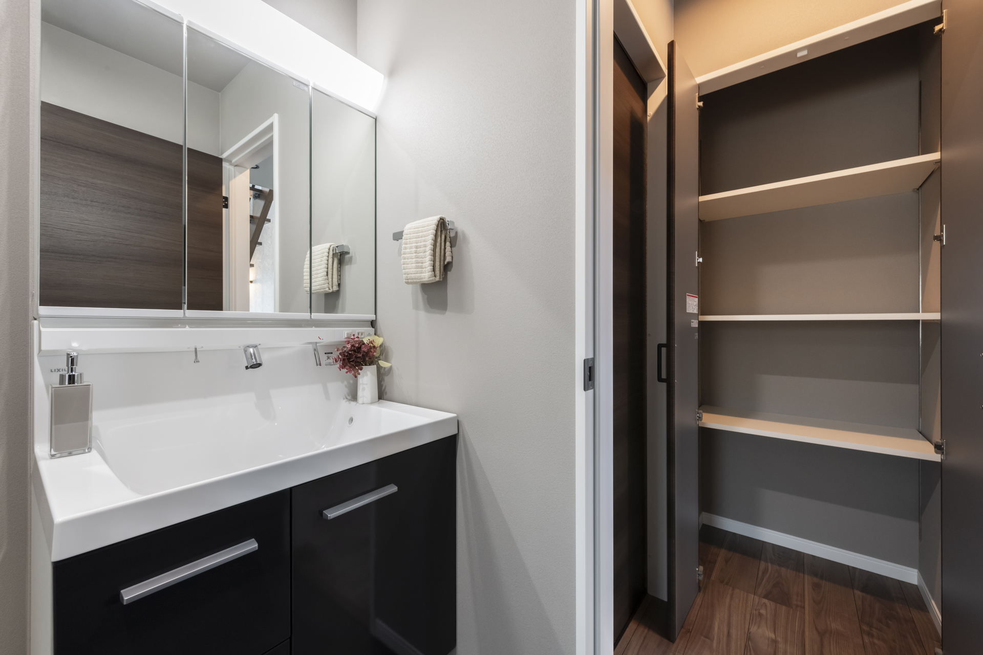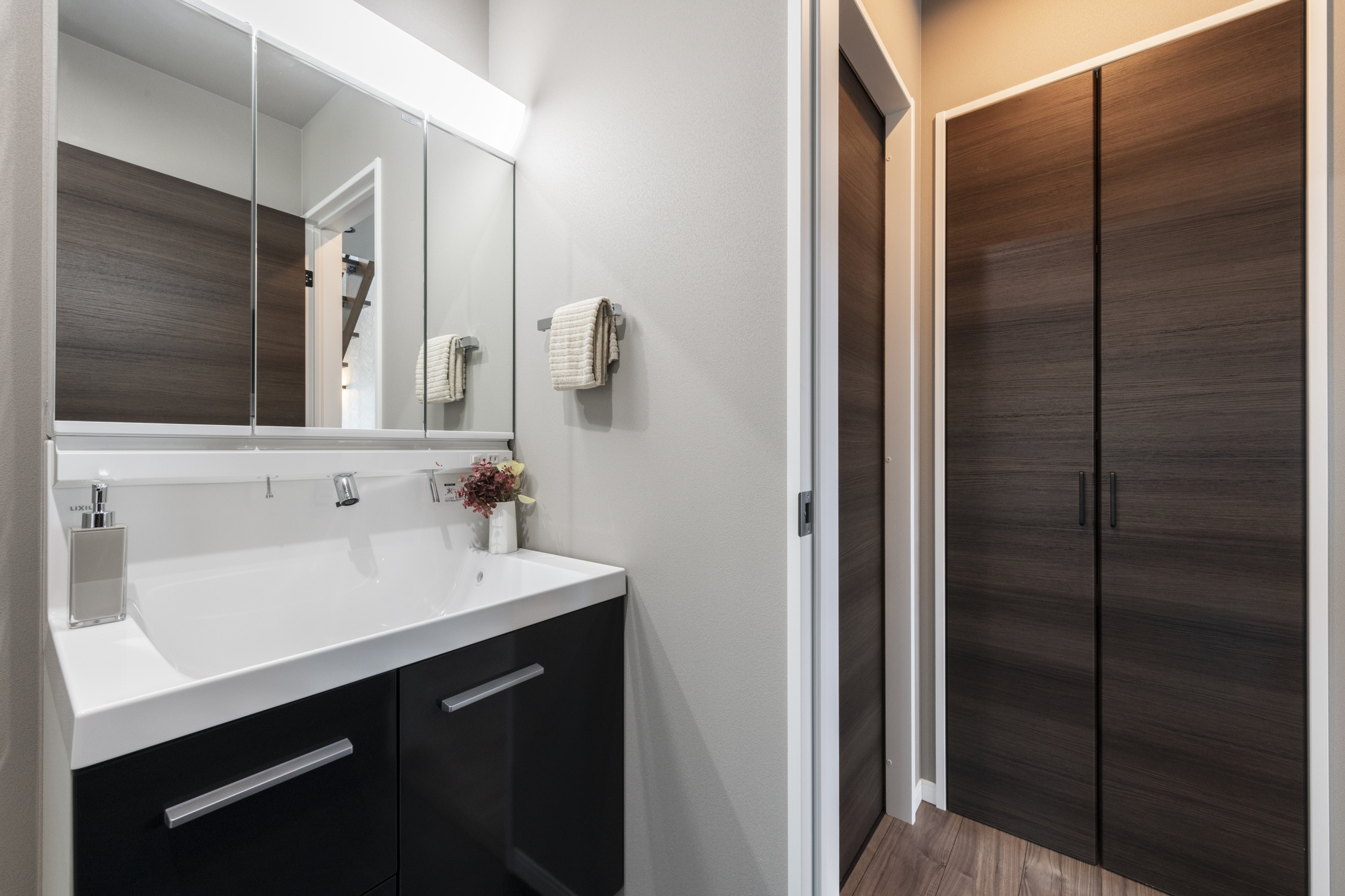 清潔感あふれる洗面化粧台は、毎朝の身支度を快適にサポートします。三面鏡の裏には収納スペースがあり、歯ブラシや化粧品、ドライヤーなどの洗面用品をすっきりと整理できます。鏡の前に物を置かずに済むため、カウンター周りを広々と使えます。