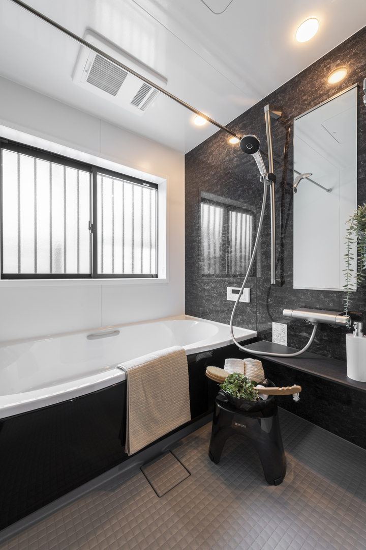お風呂は、ゆったりとくつろげる1.6坪タイプのシステムバスです。足を伸ばしてゆっくり浸かれる広さで、一日の疲れをしっかりと癒せます。ブラックのアクセントパネルがモダンで高級感のある空間を演出し、毎日のバスタイムを特別なひとときに変えてくれます。