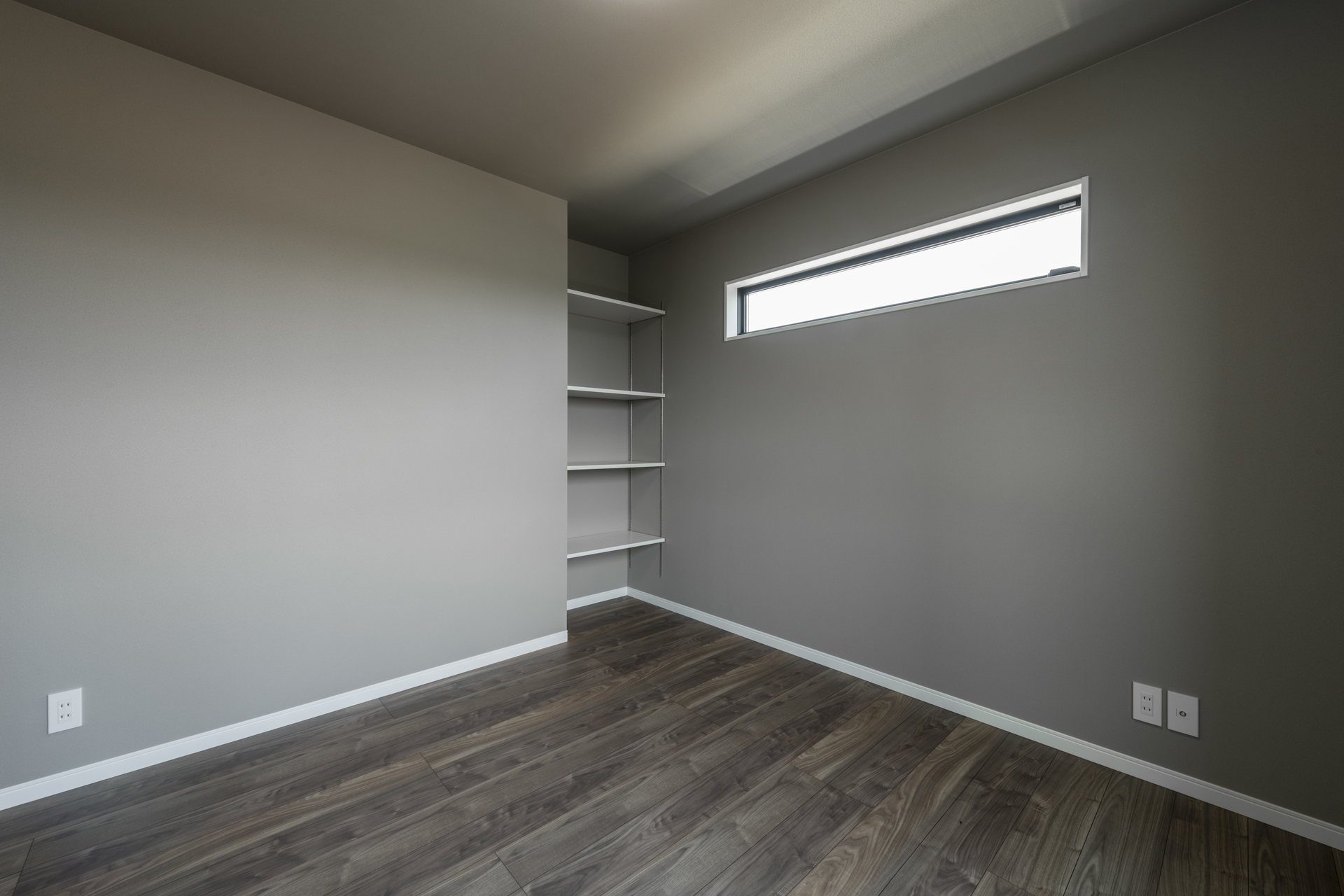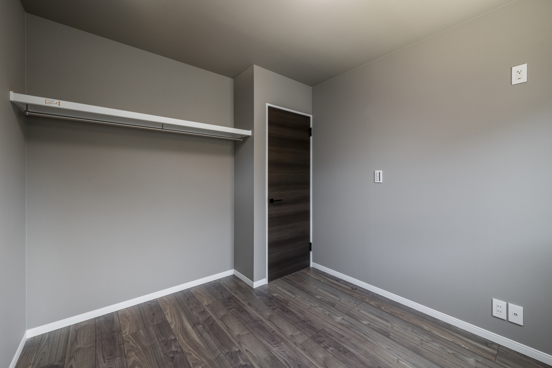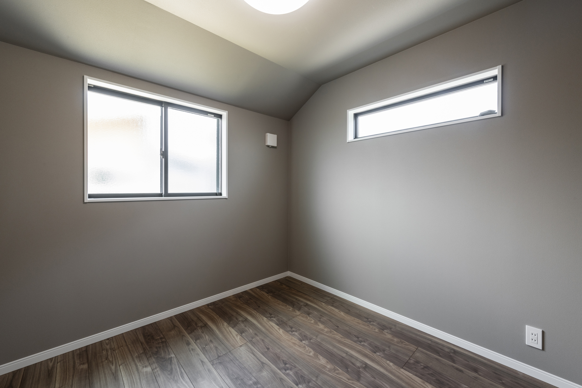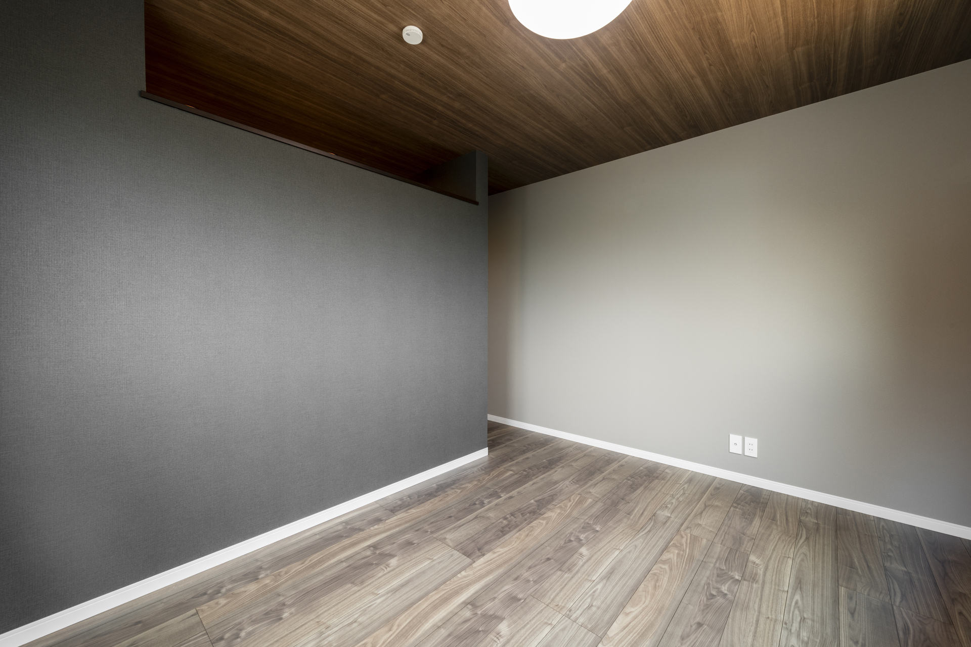グレーの壁紙とウッド調フローリングで統一された室内は、シンプルで飽きのこないデザイン。お子様の成長に合わせて、自由にコーディネートできます。学習机やベッドを置いても窮屈さを感じない適度な広さで、勉強にも休息にも適した環境です。