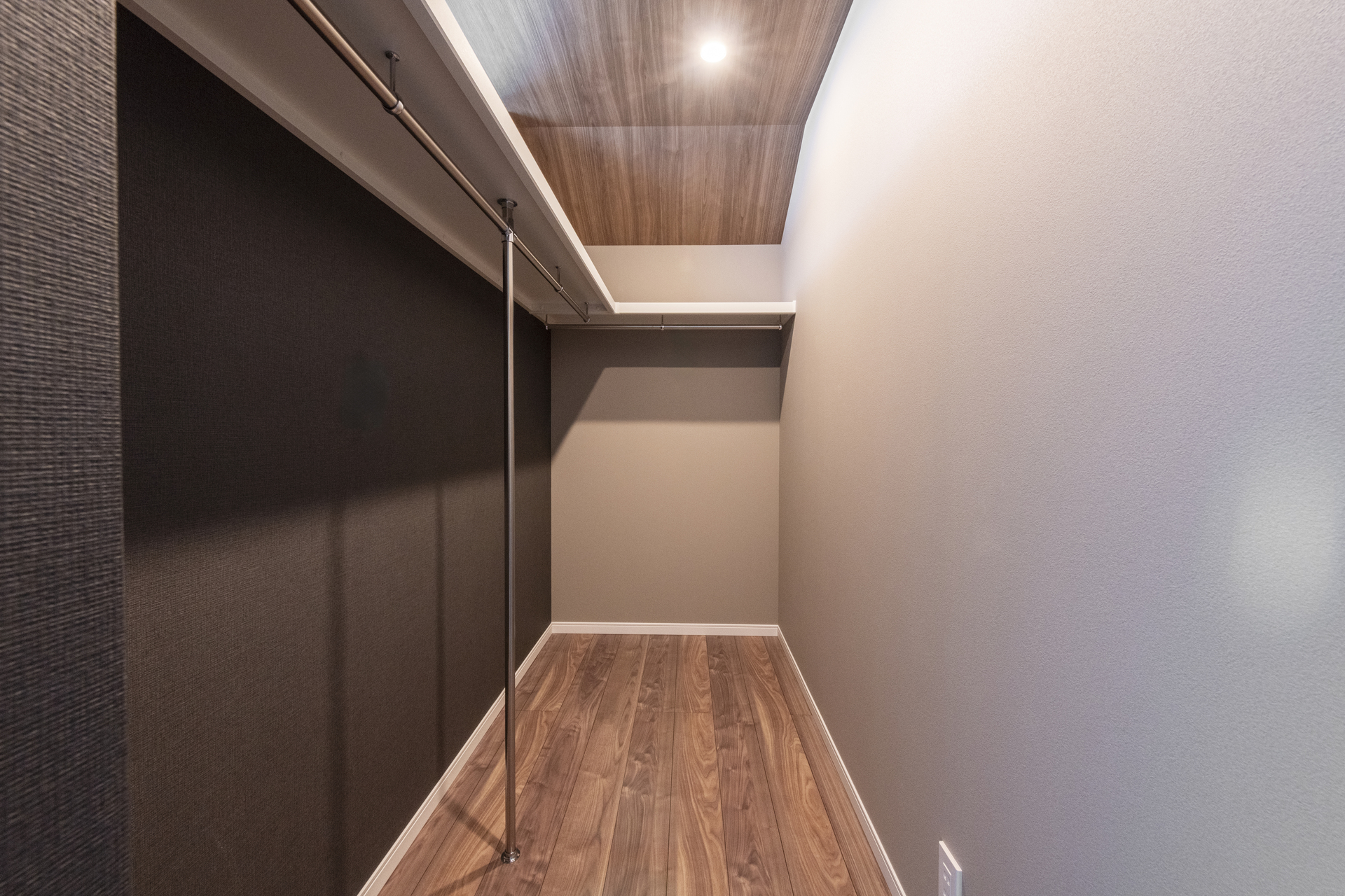 広々としたウォークインクローゼットを完備しており、家族の衣類をたっぷり収納できます。季節ごとの衣替えもスムーズで、大切な洋服をしわなく保管できます。ハンガーパイプと棚板の組み合わせで、コートやスーツ、バッグや小物まで、効率的に整理できる設計です。