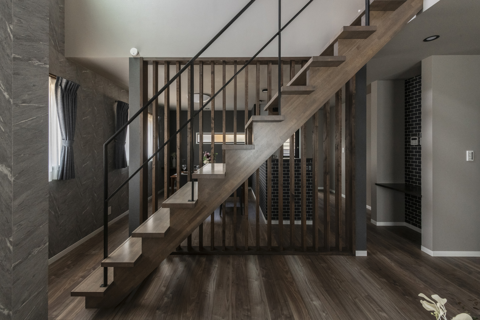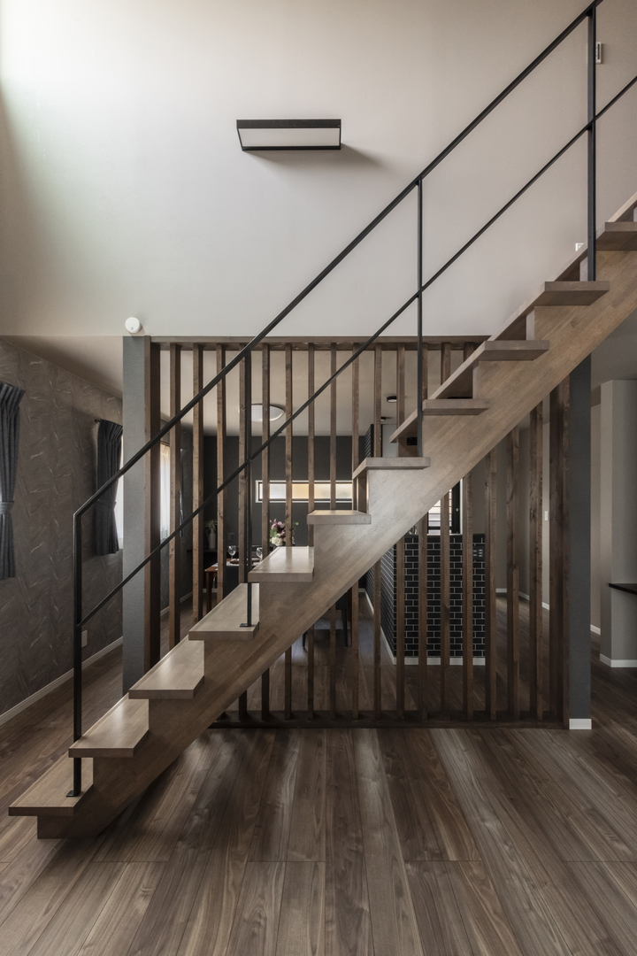 LDK空間のシンボルとなっているのが、スタイリッシュなスケルトン階段です。ブラックのスチールフレームと木製の踏み板を組み合わせた、モダンでありながら温かみを感じるデザイン。階段の蹴込み板をなくしたオープンな構造により、視線が抜けて空間を広く見せる効果があります。縦格子の間仕切りと一体的にデザインされ、リビングとダイニングを緩やかに仕切りながらも、開放感を損なわない絶妙なバランスを保っています。階段を上がる家族の姿が、リビングから自然と目に入り、家族のつながりを感じられる温かな設計です。