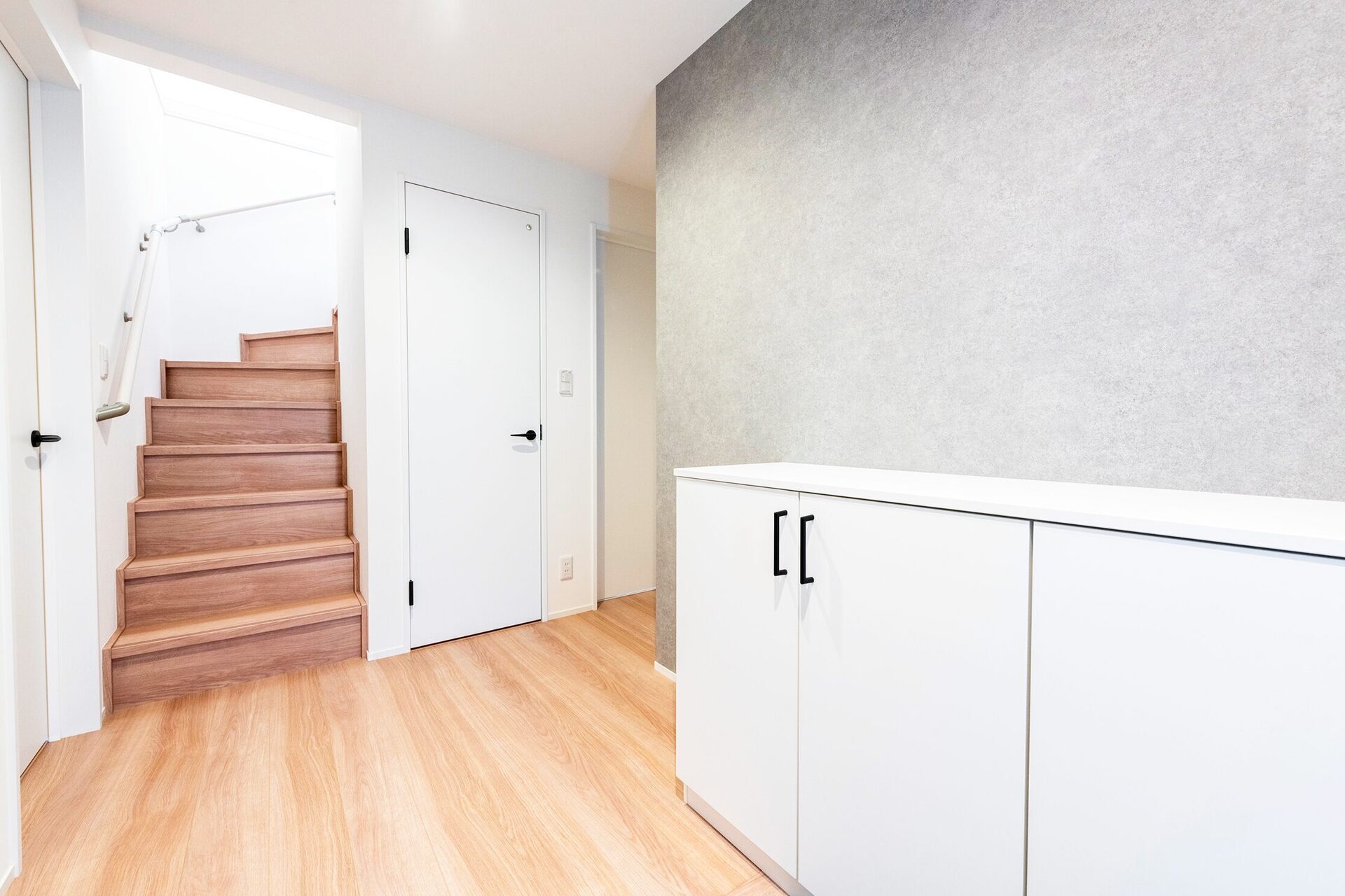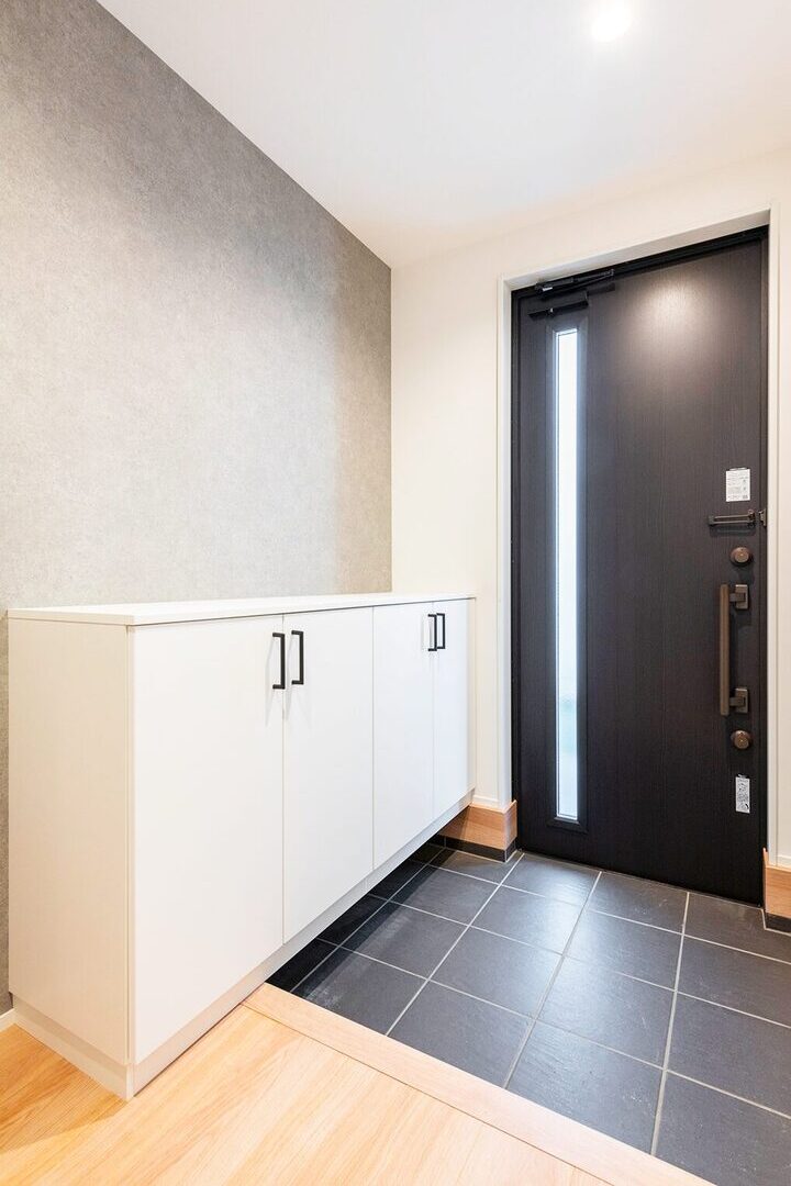 玄関収納はしっくいホワイト柄で、家族の靴をたっぷり収納でき、玄関周りをすっきりと保てます。カラーテレビドアホンで来客確認も安心です。