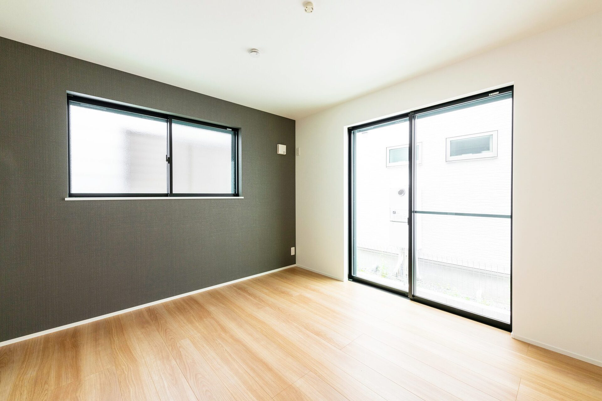 バルコニーへ直接アクセスでき、洗濯物を干す動線も抜群。大きな窓から自然光がたっぷり入り、明るく開放的です。LDKと同じフロアにあるため、家事をしながらこの部屋で過ごす家族の様子を確認しやすく、小さなお子様の遊び部屋としても安心して使えます。