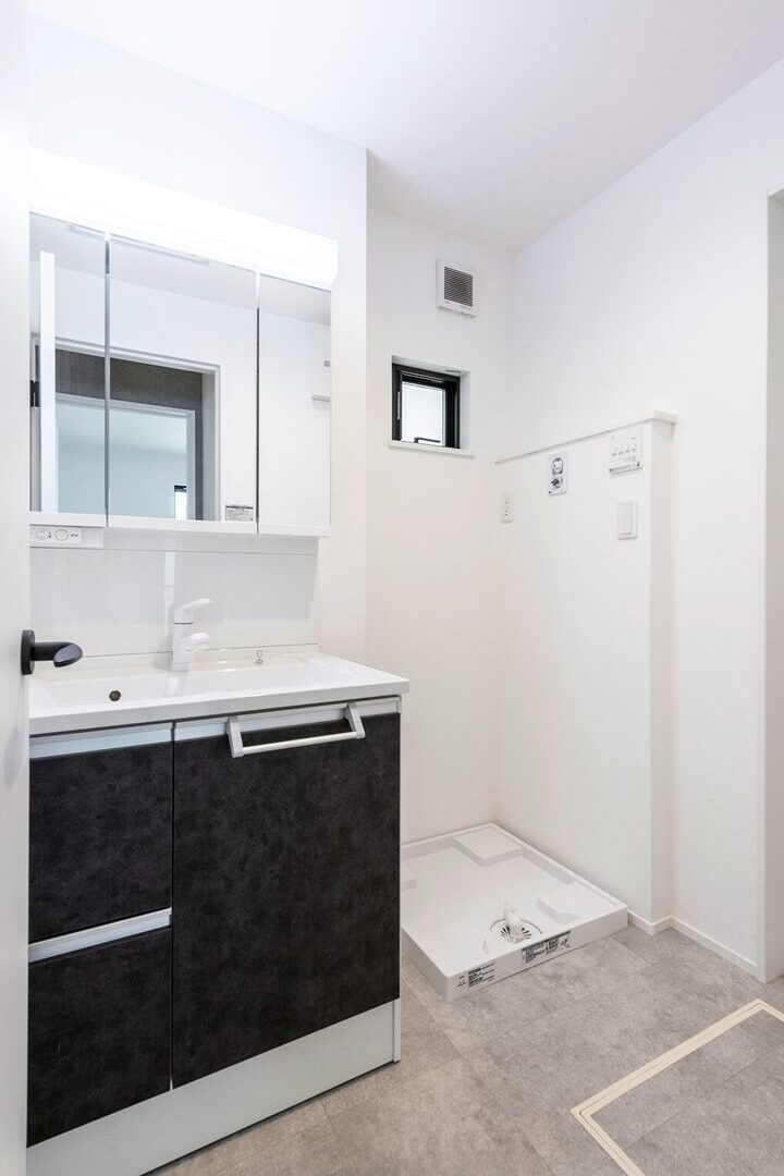 清潔感あふれる洗面化粧台は、毎朝の身支度を快適にサポートします。三面鏡の裏には収納スペースがあり、歯ブラシや化粧品、ドライヤーなどの洗面用品をすっきりと整理できます。