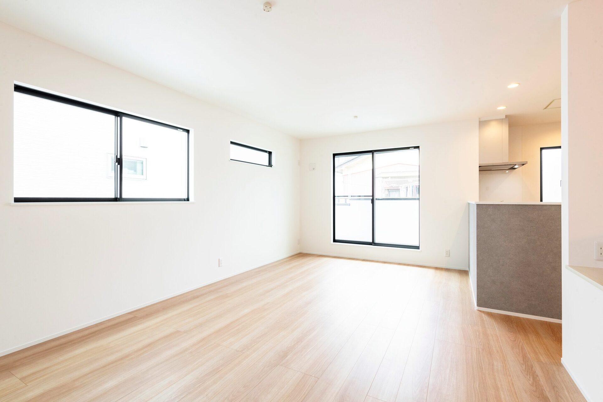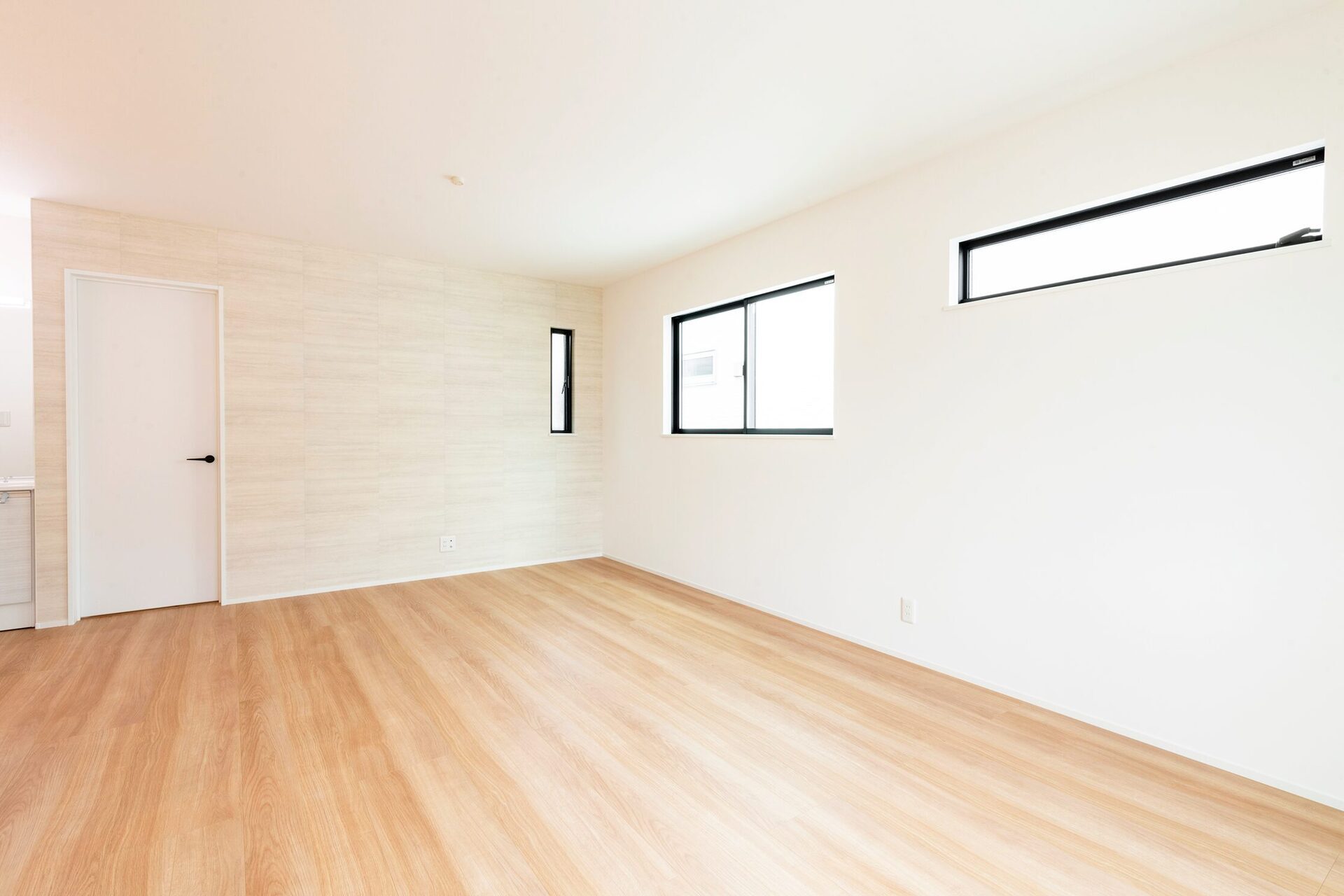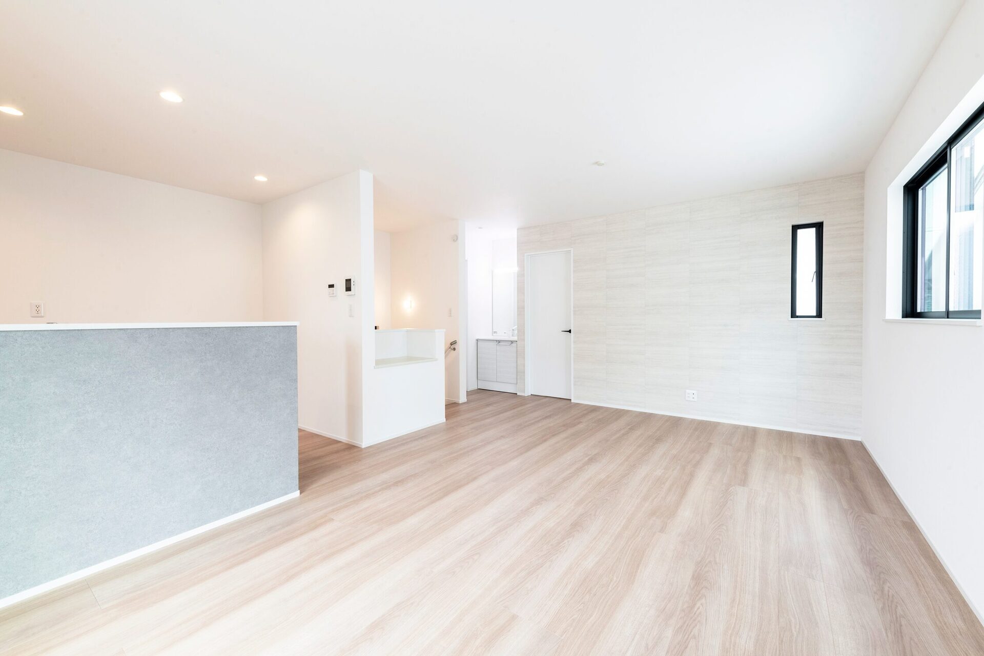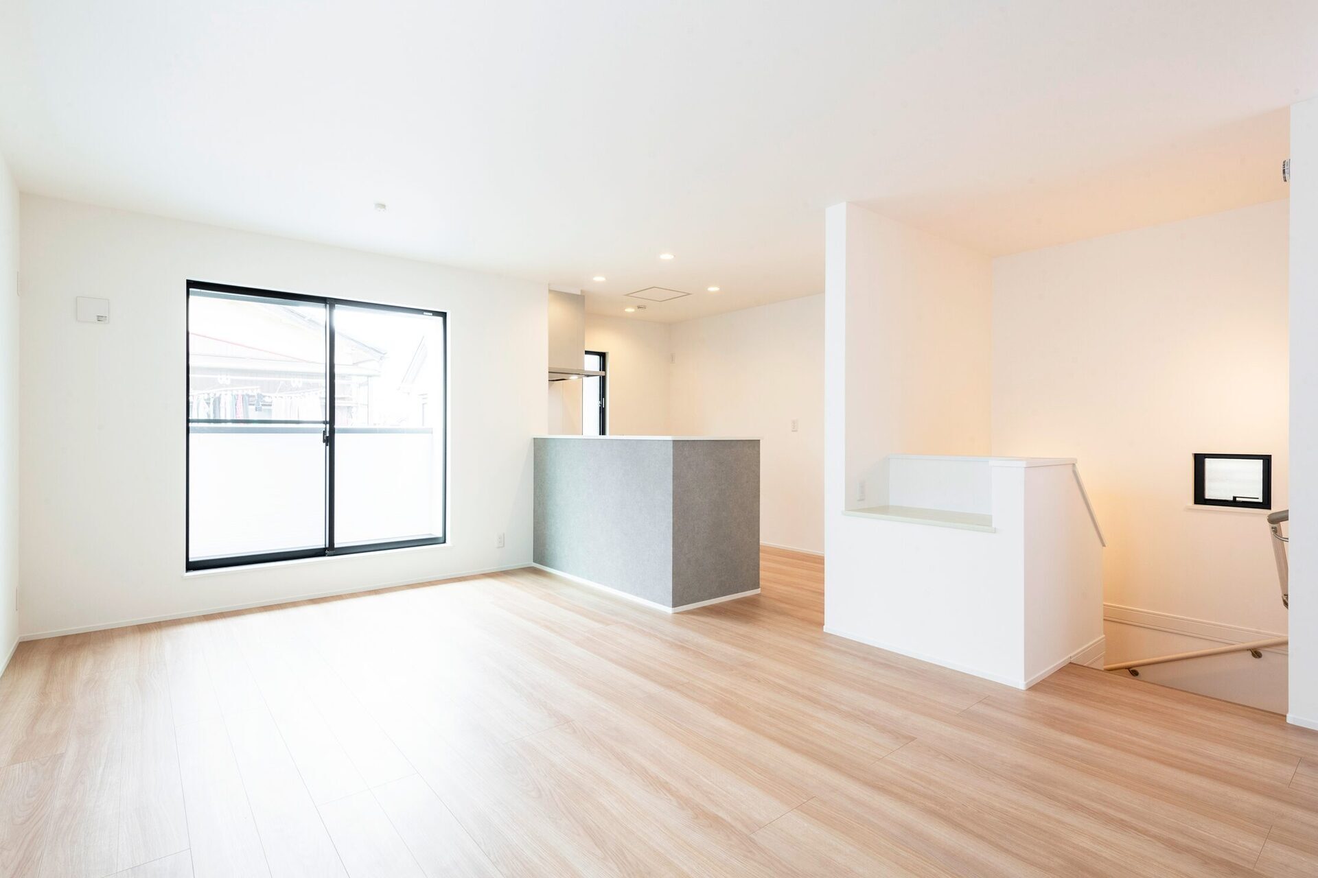 階段を上がると、約18.1帖の広々としたLDKが広がります。2階配置により天井が高く開放感抜群。大きな窓から差し込む自然光が室内を明るく照らし、周囲の視線を気にせずプライバシーを保ちながら明るい空間を楽しめます。
