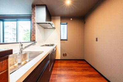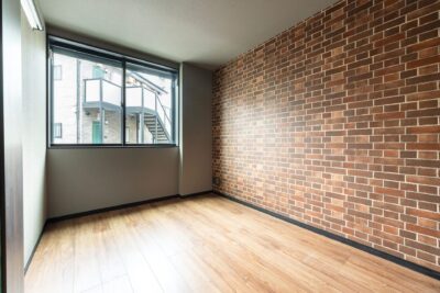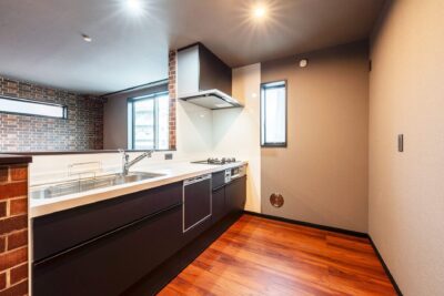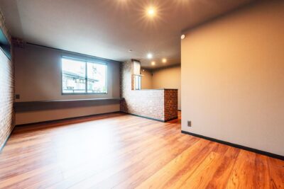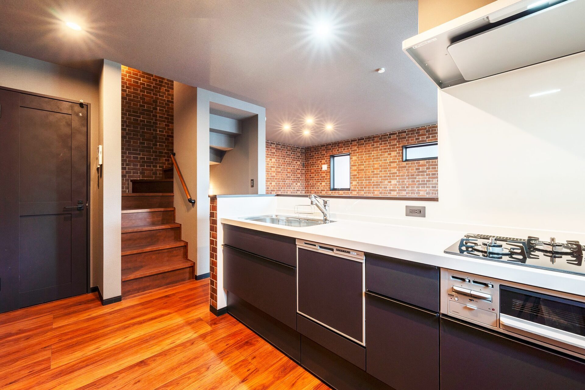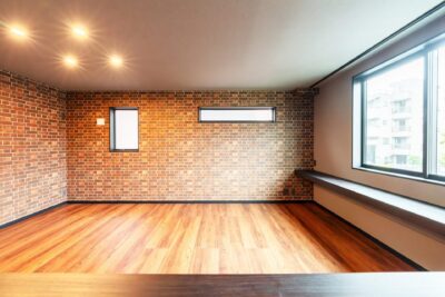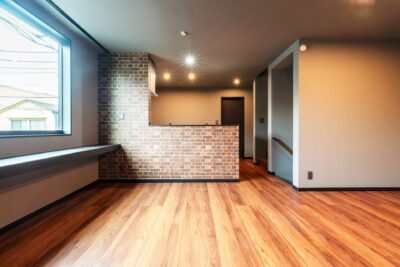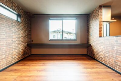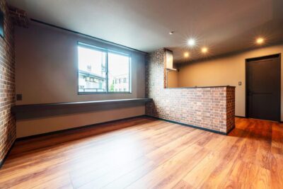 約16畳の広々としたLDKは、2階に配置されることで採光を最大限に確保しています。温かみのあるブラウン系のレンガ調壁紙が空間全体を包み込み、都会にいながらもどこか懐かしさを感じる、心地よい雰囲気を演出。白い壁とのコントラストが空間に立体感を与え、インダストリアルでありながら温もりのある空間を作り上げています。