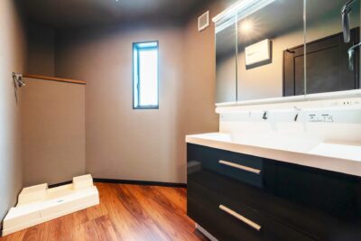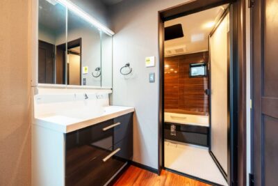 ミラー裏には収納スペースがあり、日用品のストックや美容グッズをたっぷりと収納できます。洗面台下の収納も充実しており、タオルや洗剤類を整理整頓。見せたくないものはすべて収納でき、洗面室を常にすっきりと保てます。