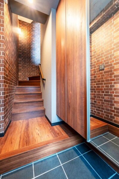 照明はダウンライトですっきりとまとめ、玄関全体を均一に照らします。夜遅く帰宅した時も、温かな光が迎え入れてくれる安心感があります。