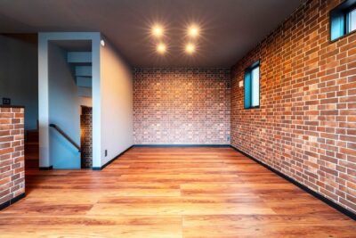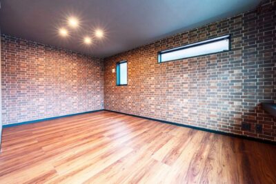 チャコールブラックのフローリングとレンガ壁の組み合わせは、ヴィンテージ感と現代的な洗練さを絶妙にミックス。カフェやギャラリーのような、少し特別な空間で過ごすような感覚を、日常の中で味わえます。