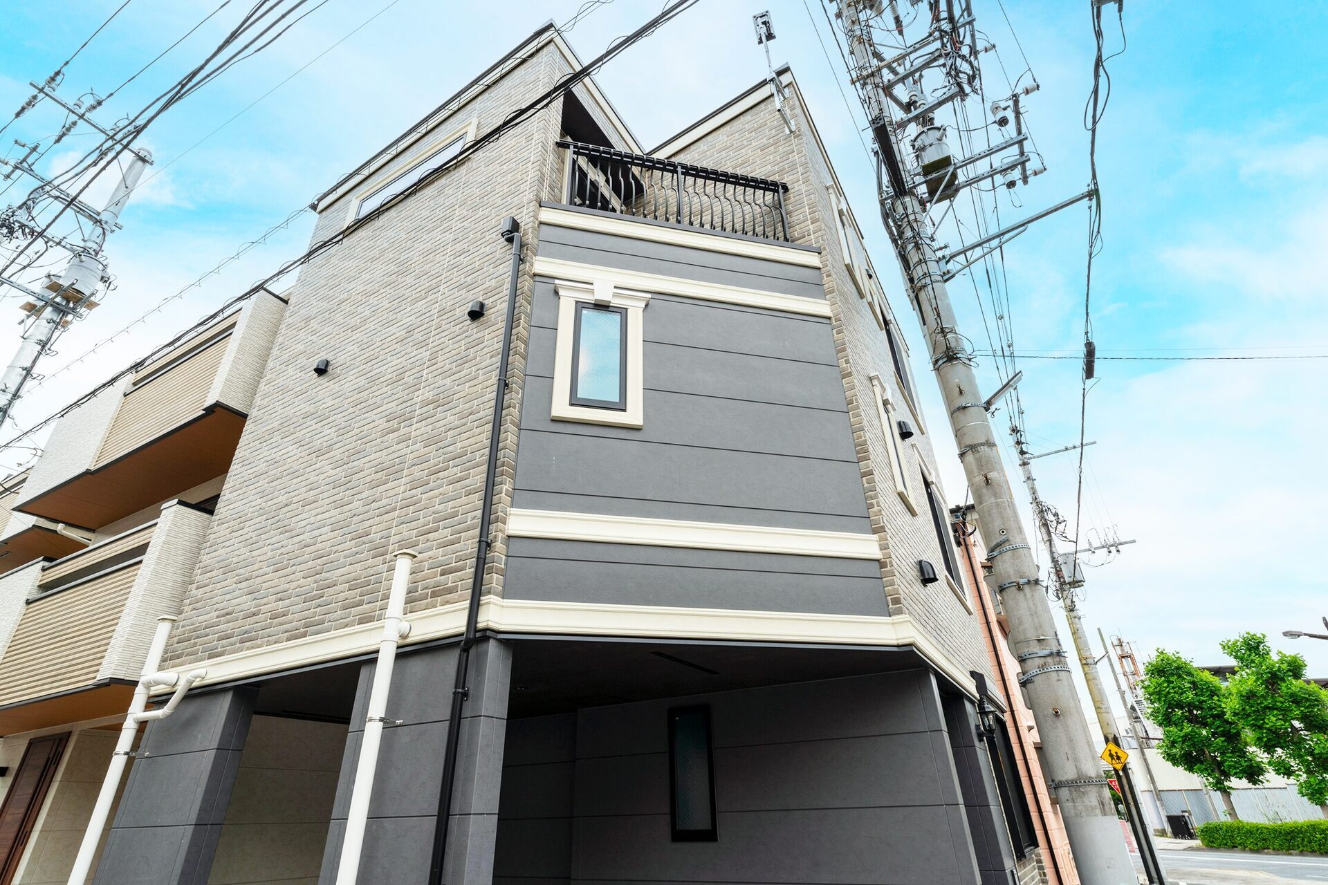 グレーのタイル外壁にブラックサッシが映える、スタイリッシュな外観デザイン。縦長の窓が建物に軽やかなリズムを生み出し、直線的なフォルムが都市の景観に調和します。表情豊かなグレーのタイルは、光の角度によって微妙に表情を変え、朝の柔らかな光の中では優しく、夕暮れ時には陰影が際立ち、建物に奥行きを与えます。ブラックのサッシとバルコニーの手すりが、縦横のラインを強調し、現代的な印象を際立たせています。