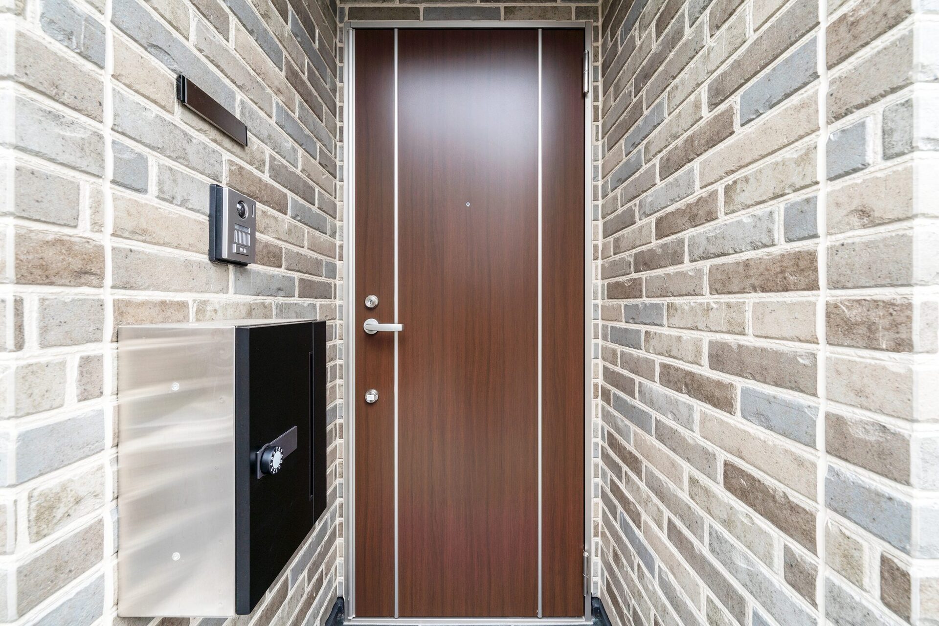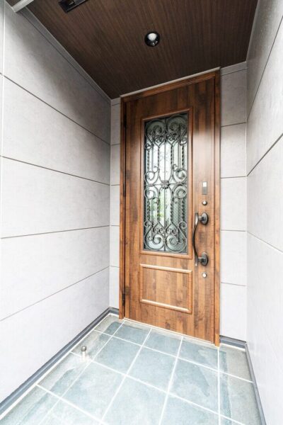 重厚感のある木目調の防火ドアが、住まいへの期待感を高めます。アイアン調のデザインが施された扉は、モダンでありながらどこかクラシカル。装飾的でありながら主張しすぎない繊細な意匠が、玄関に品格を与えています。