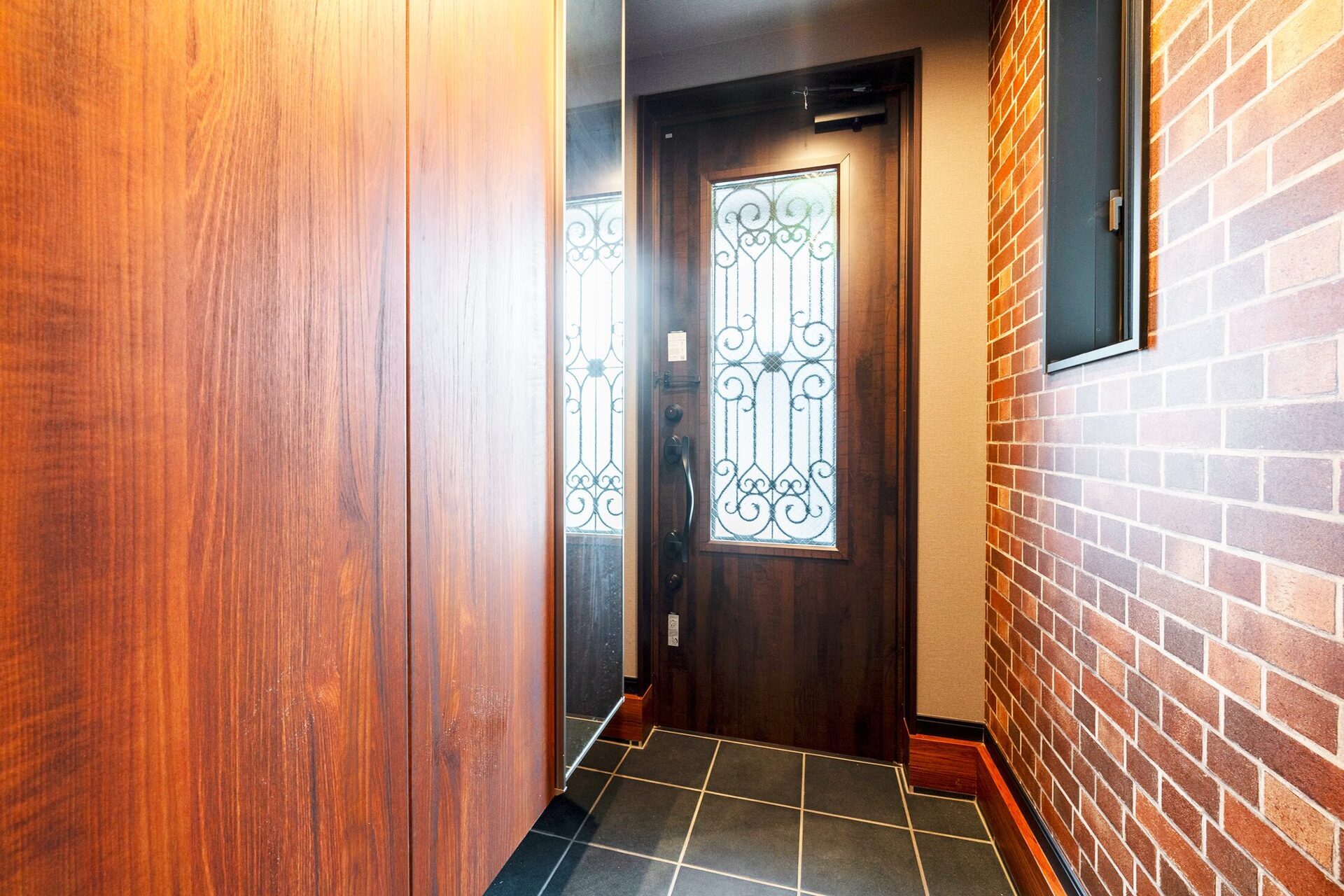 重厚感のある木目調の防火ドアが、住まいへの期待感を高めます。アイアン調のデザインが施された扉は、モダンでありながらどこかクラシカル。装飾的でありながら主張しすぎない繊細な意匠が、玄関に品格を与えています。