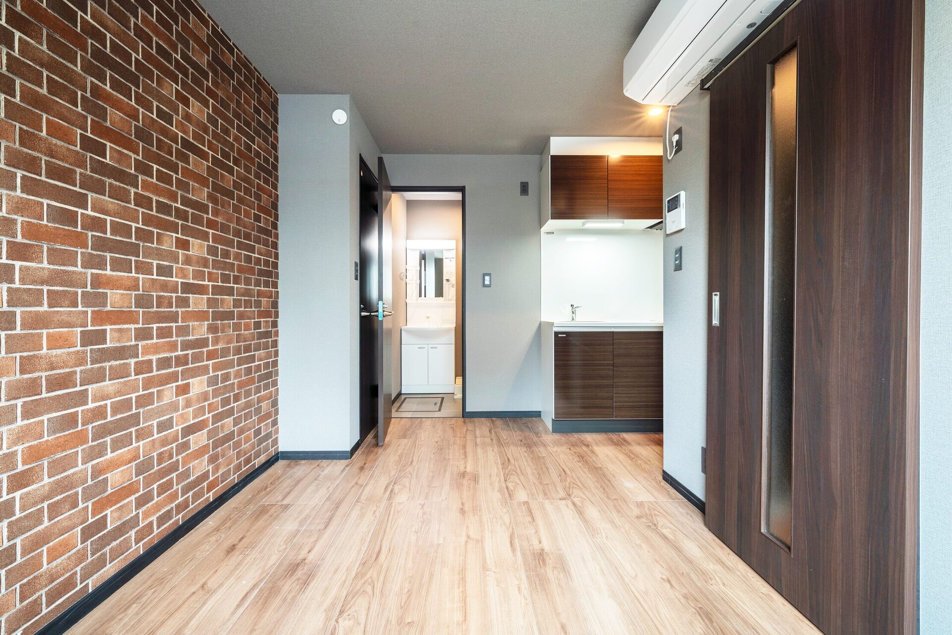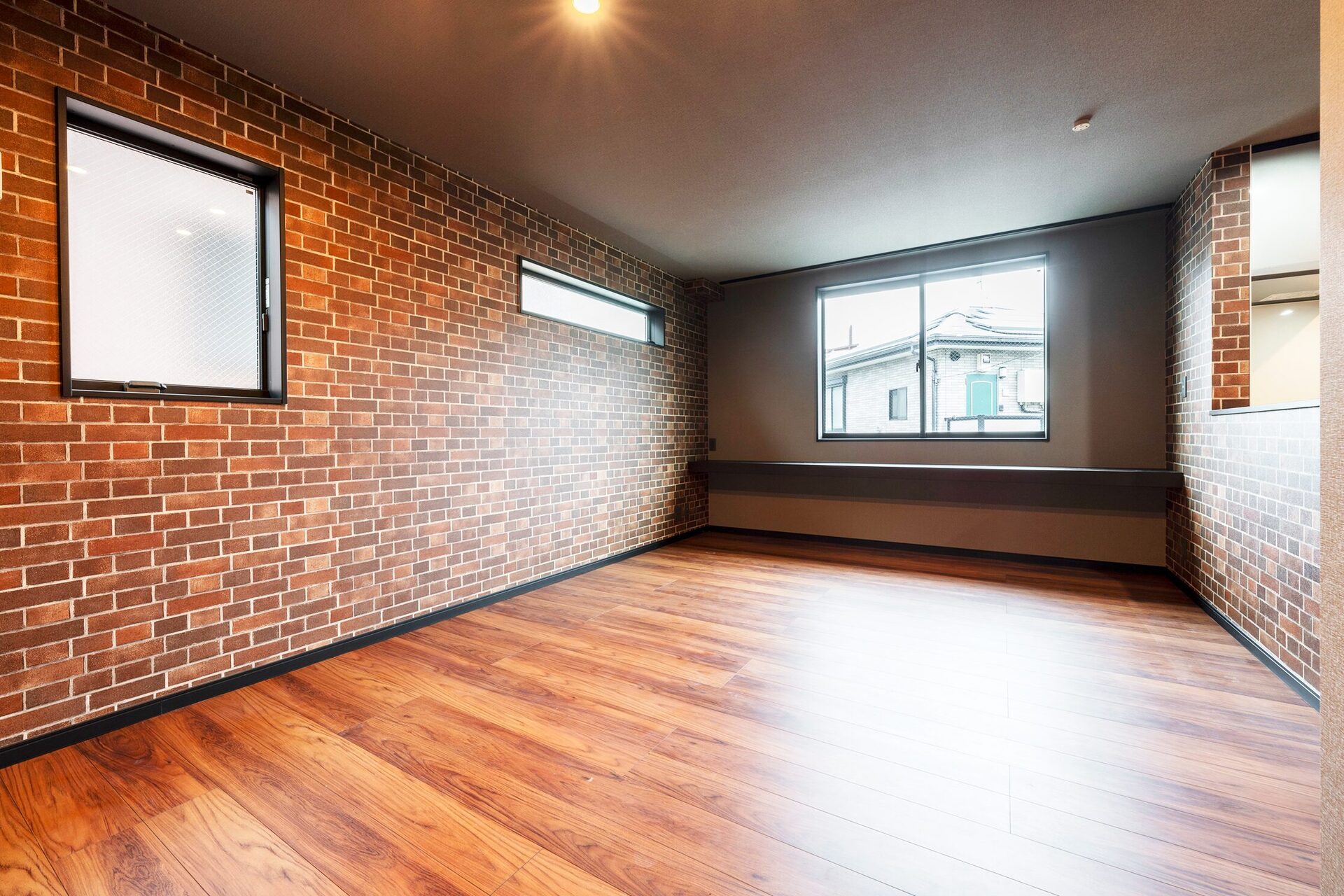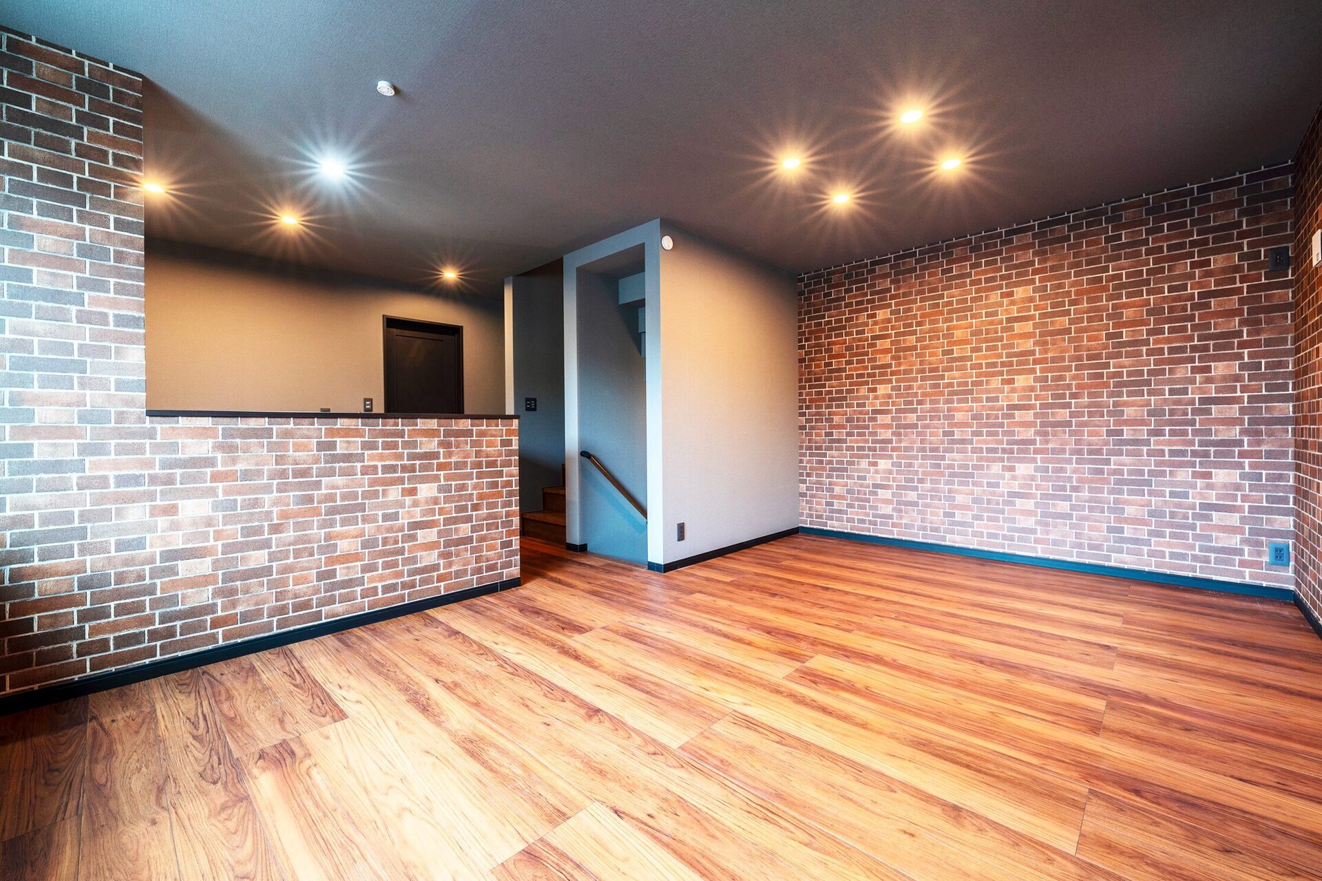 約16畳の広々としたLDKは、2階に配置されることで採光を最大限に確保しています。温かみのあるブラウン系のレンガ調壁紙が空間全体を包み込み、都会にいながらもどこか懐かしさを感じる、心地よい雰囲気を演出。白い壁とのコントラストが空間に立体感を与え、インダストリアルでありながら温もりのある空間を作り上げています。