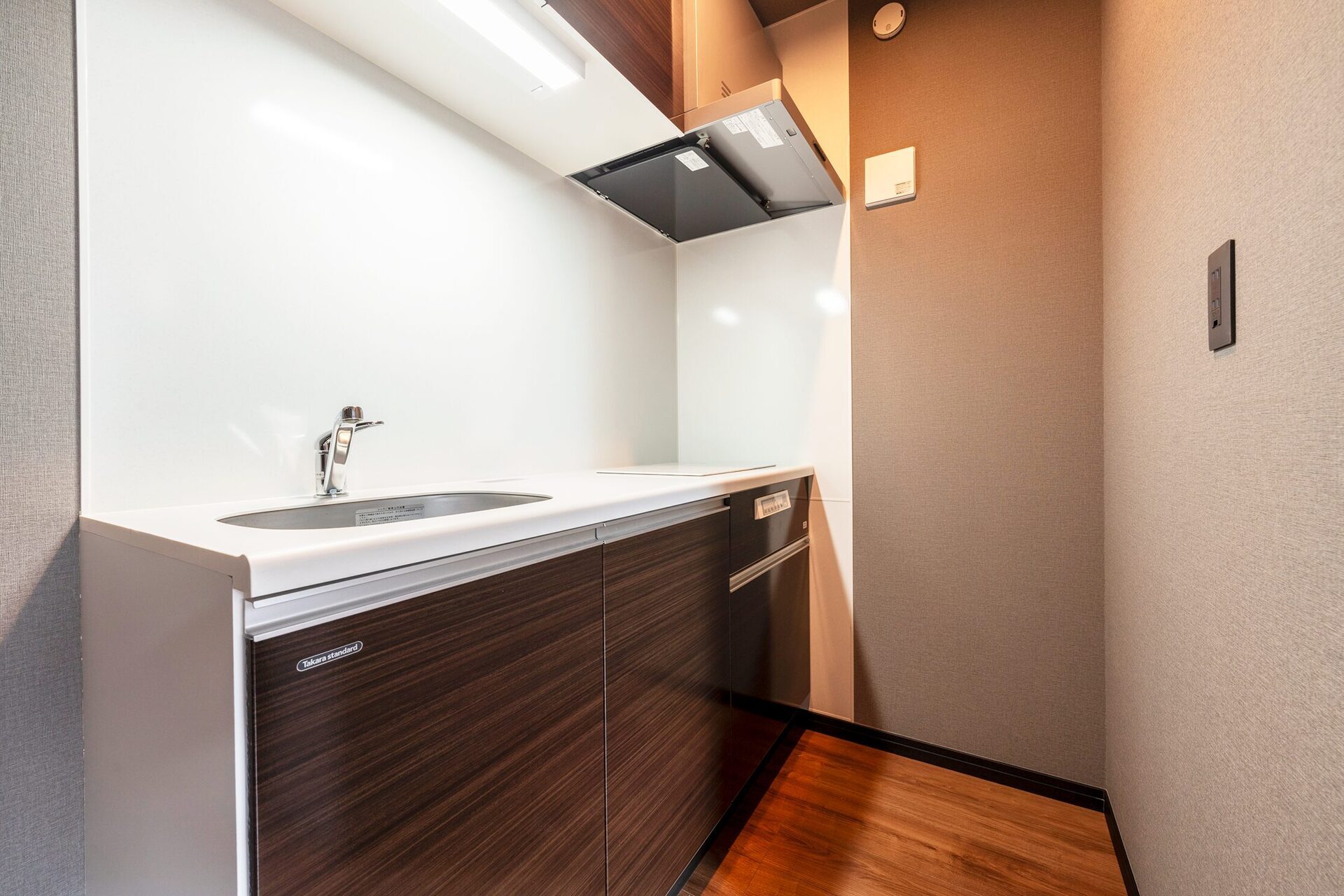 コンパクトながら圧迫感のない設計で、快適に使用できます。手洗いカウンター付きで、使い勝手も良好。ダウンライトの柔らかな光が、落ち着いた雰囲気を演出します。