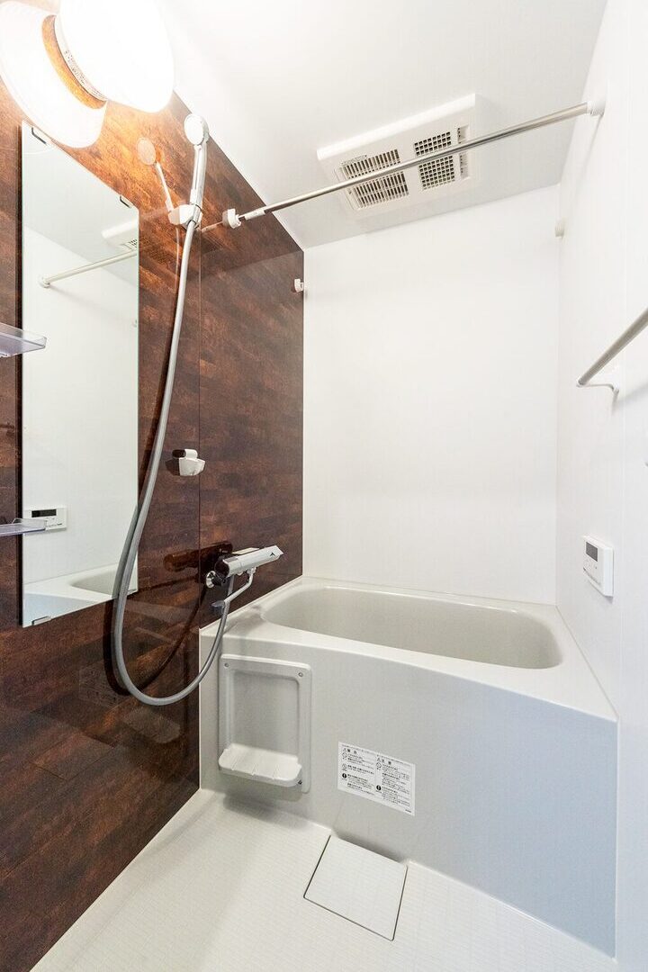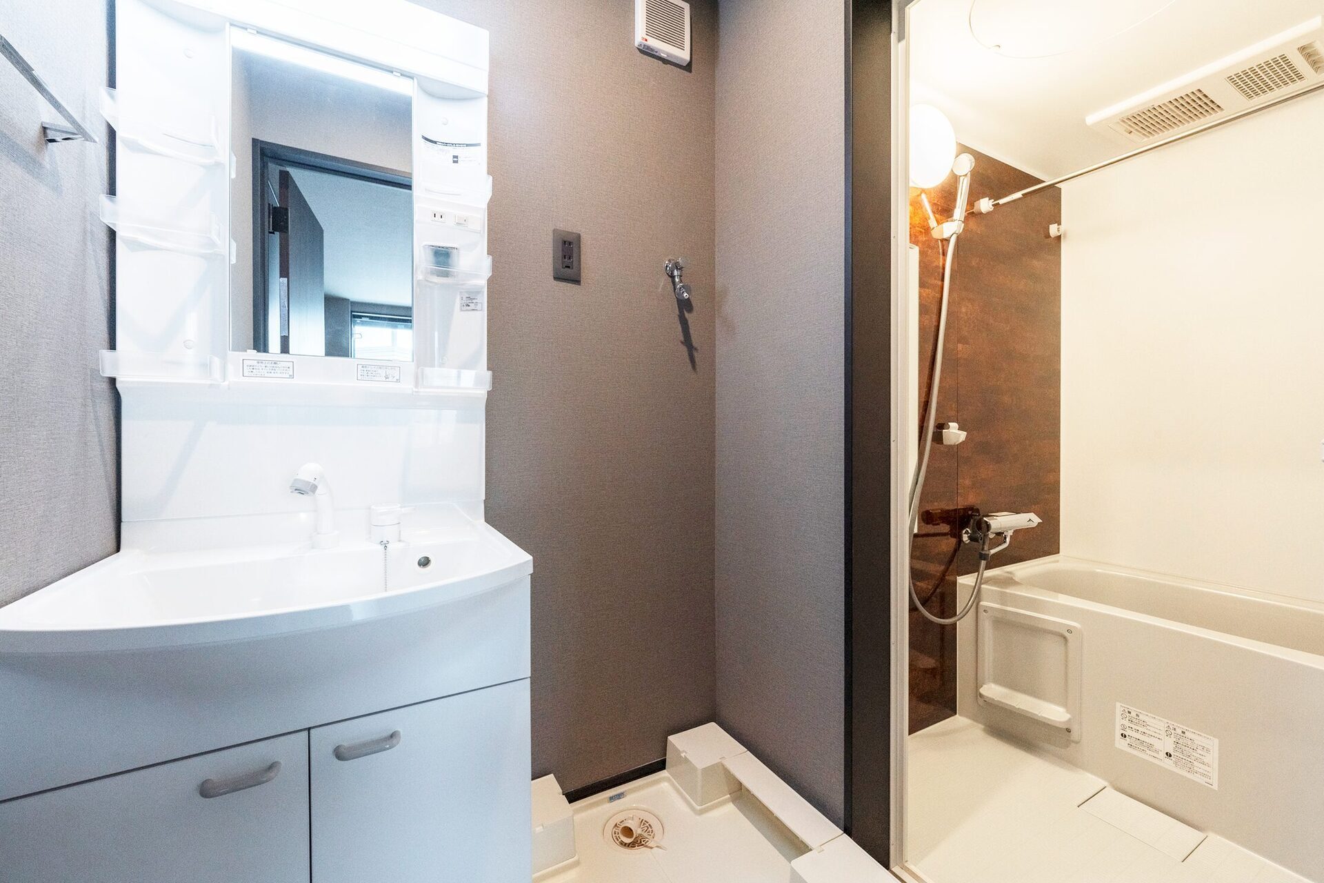 バスルームは、まるでホテルのような落ち着いた雰囲気。濃淡が生み出す陰影が、リラックス効果を高め、一日の疲れを優しく癒してくれます。
