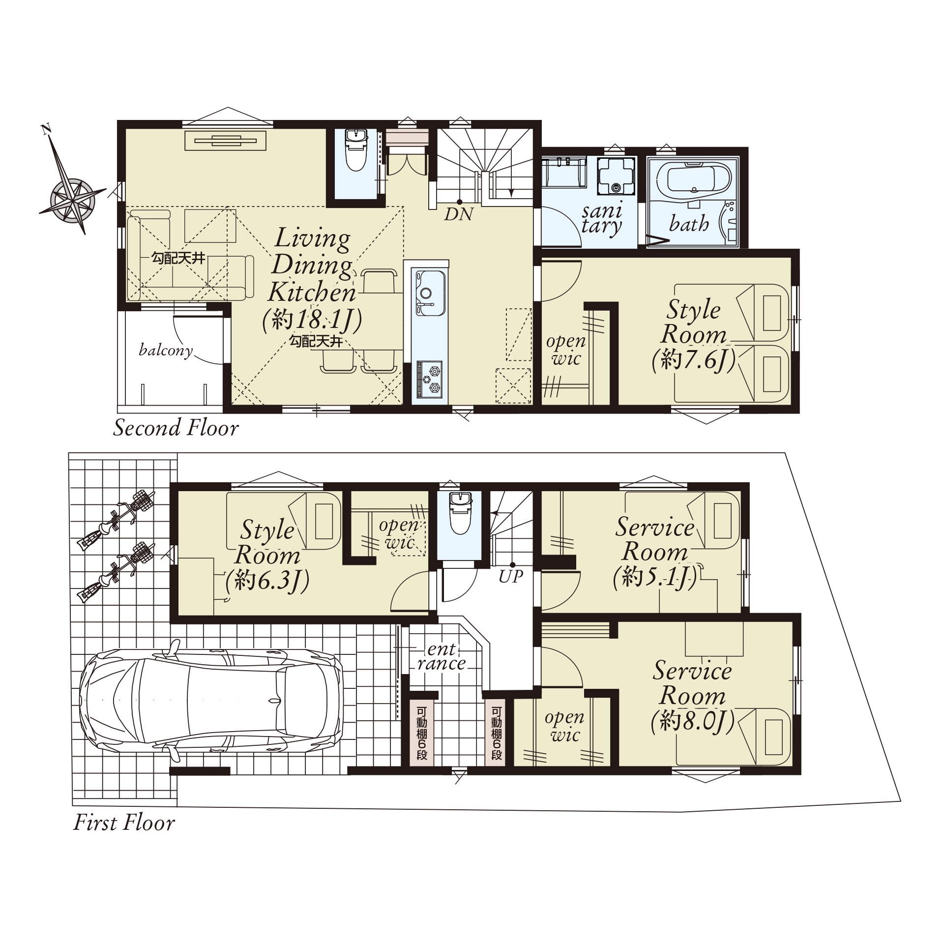 内装は温もりを感じるダークブラウンとオフホワイトを基調としており、格子や、勾配になった天井はデザイン性と上品さを感じさせます。窓が多く光を効率的に取り込めるのも魅力的です。洋室とサービスルームを併せてオープンウォークインクローゼットが3つ付いているので収納も十分です。