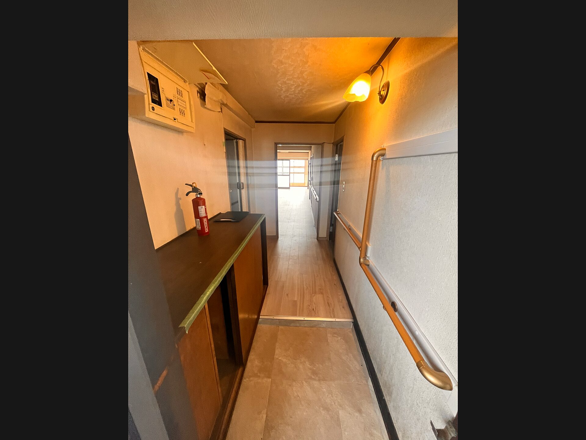 築年数を感じる玄関廊下。古い下駄箱や露出した配管、暗い照明が経年劣化を物語っています。