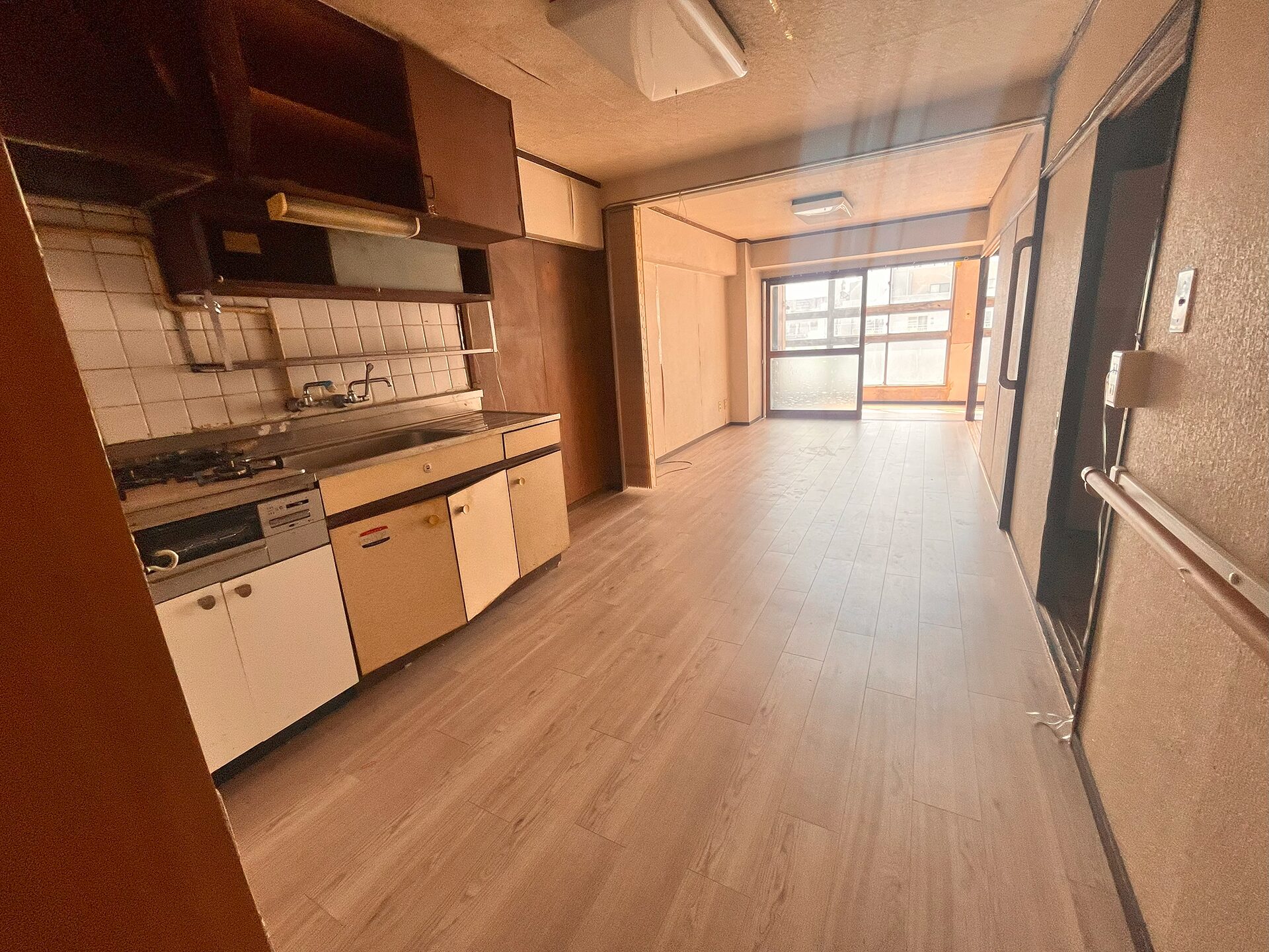 壁付けL型キッチンとタイル壁、隣接する和室のある旧来の間取り。経年劣化した内装と細長い空間が閉鎖的な印象を与えていました。
