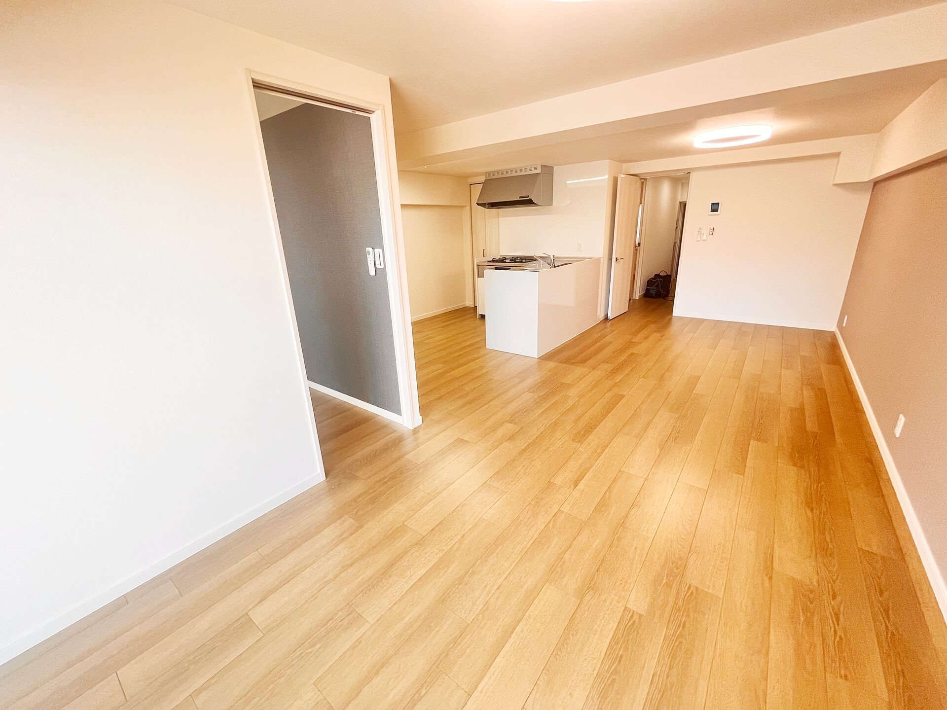 和室を洋室化し、対面キッチンを備えた明るいLDKに。グレーのアクセントクロスと木目フローリング、大型レンジフードと充実した収納で、機能性とデザイン性を両立した空間に生まれ変わりました。