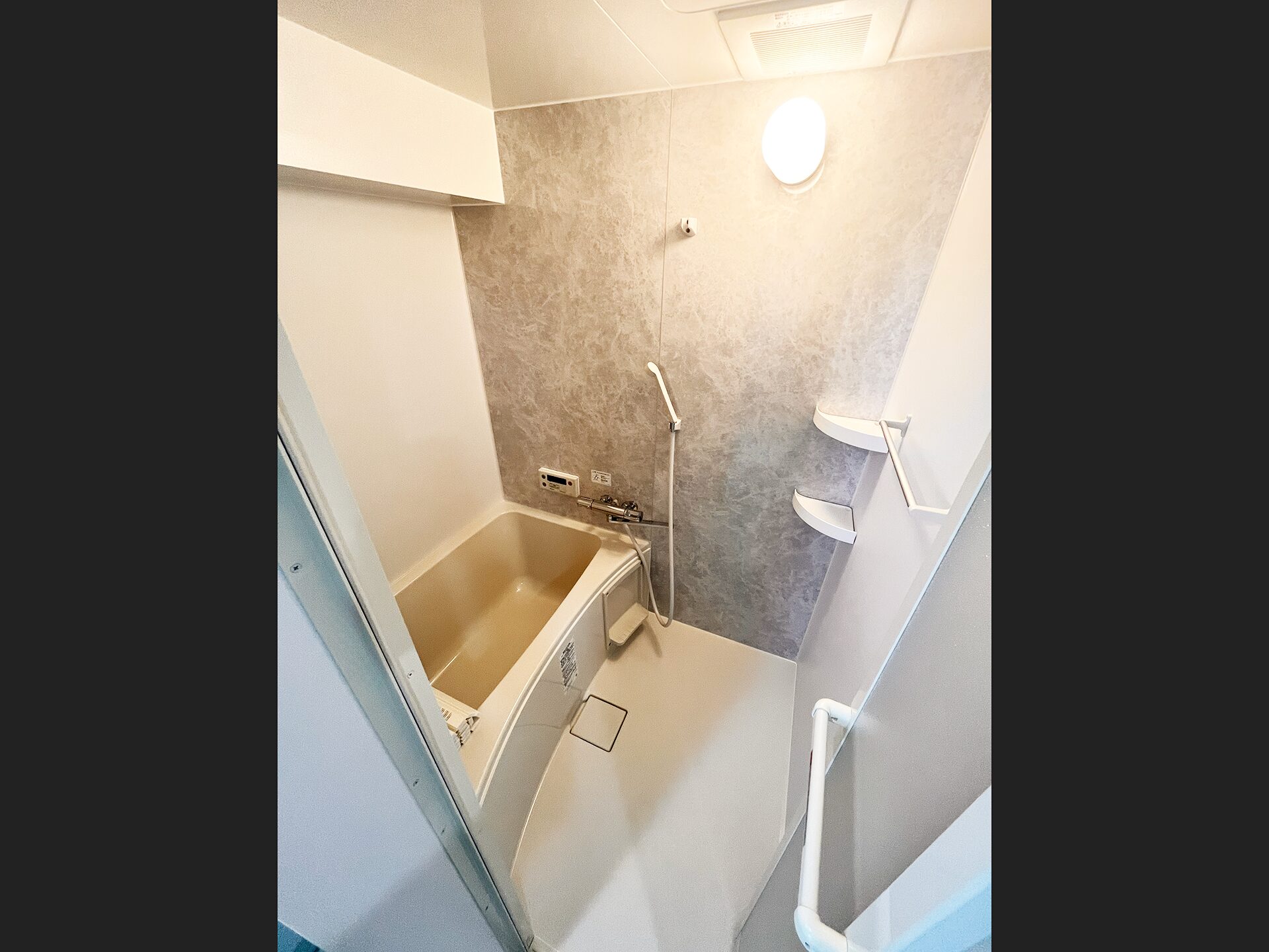 最新のユニットバスに交換。大理石調のアクセントパネルと浴室乾燥機で、快適でお手入れしやすい浴室になりました。