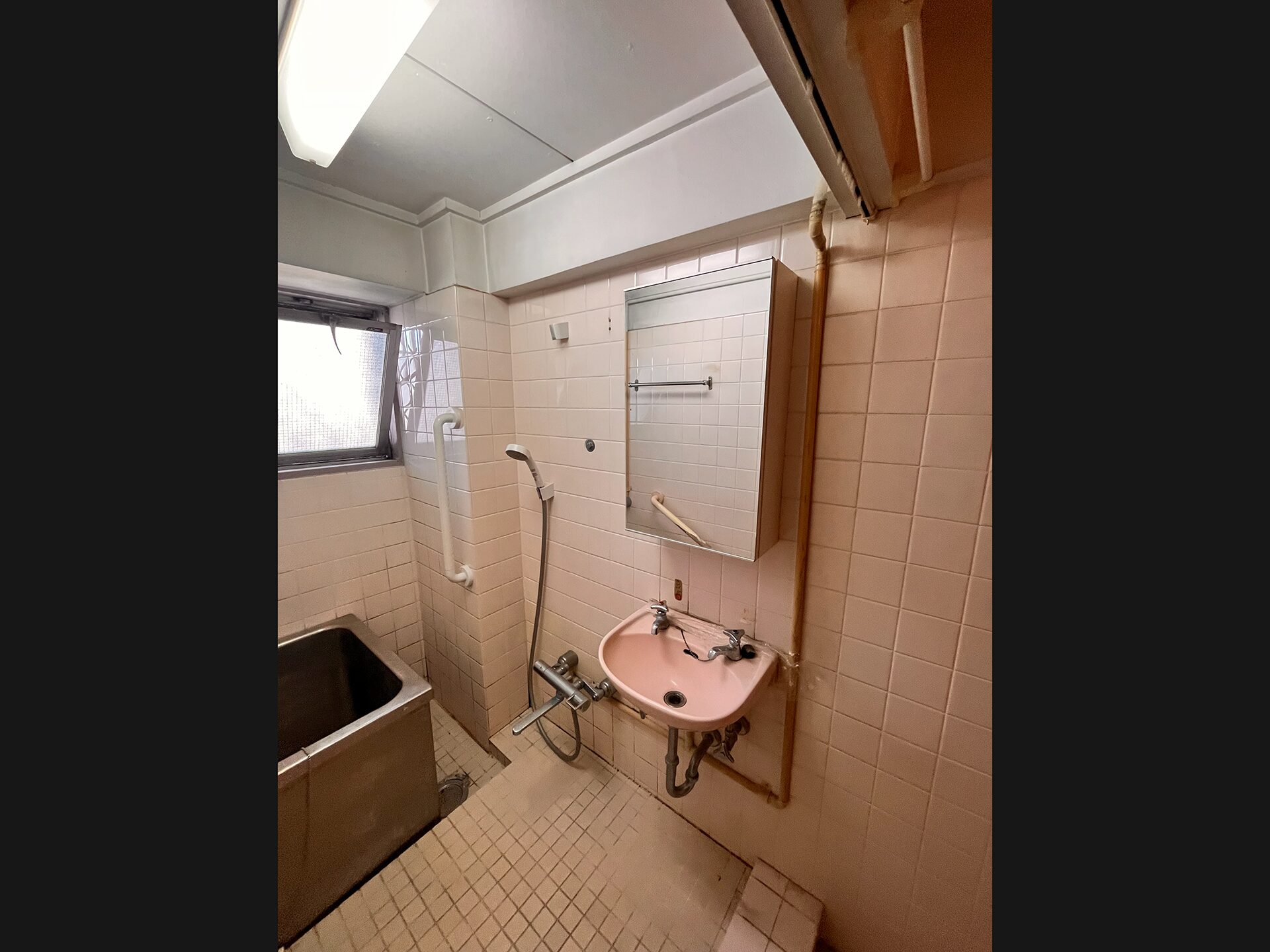 在来工法のタイル壁とステンレス浴槽。露出した配管や古い設備が、築年数を感じさせます。