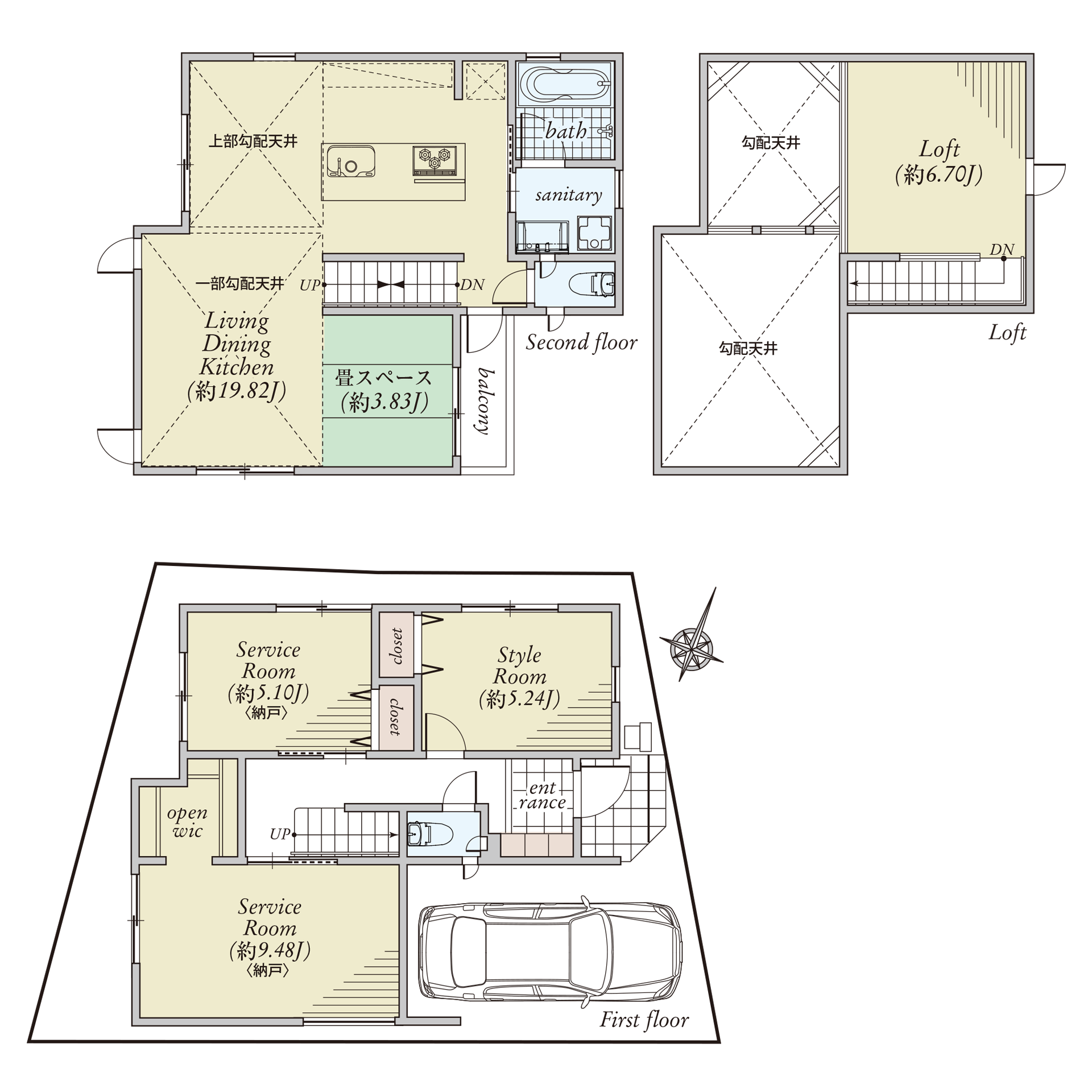 シルエットがシンプルながら、白い外壁を縁取る黒のラインと木製のドアが映えるスタイリッシュなお宅。フローリングや建具の木目が際立つナチュラルな風合いが特徴です。空間に溶け込むモダンな疊間は寛ぎの空間に。その向かいの壁面には高さのある窓が両サイドに付いており、明るさと開放感をもたらします。階段と窓付きの広々としたロフトは換気も十分で使い方が広がります。